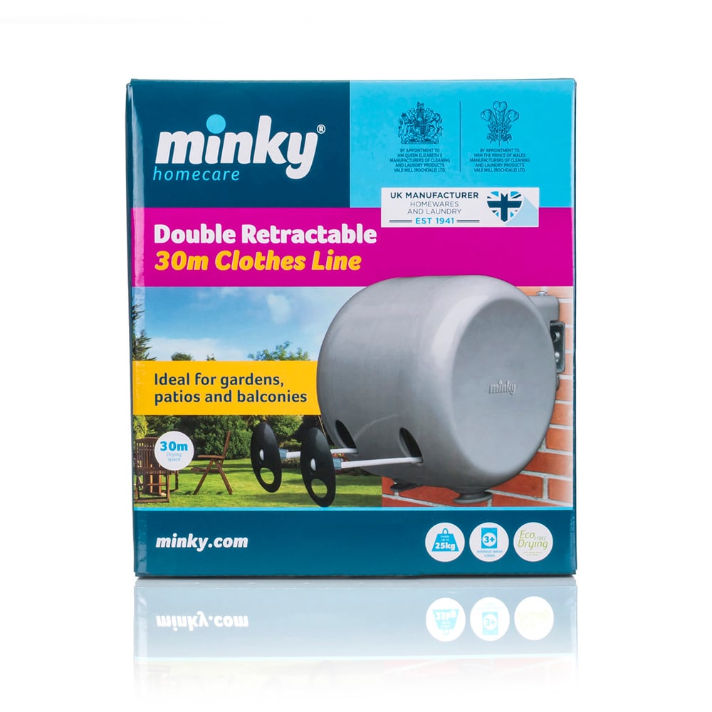 Dry your clothes on this Minky Duo Retractable Reel Washing Line. This retractable reel has two separate lines which create up to 30m of line drying space. Easy to use, it attaches to the wall with a special bracket, so you can remove the reel when not in use. Also, the PVC-coated lines are easy to wipe clean.
