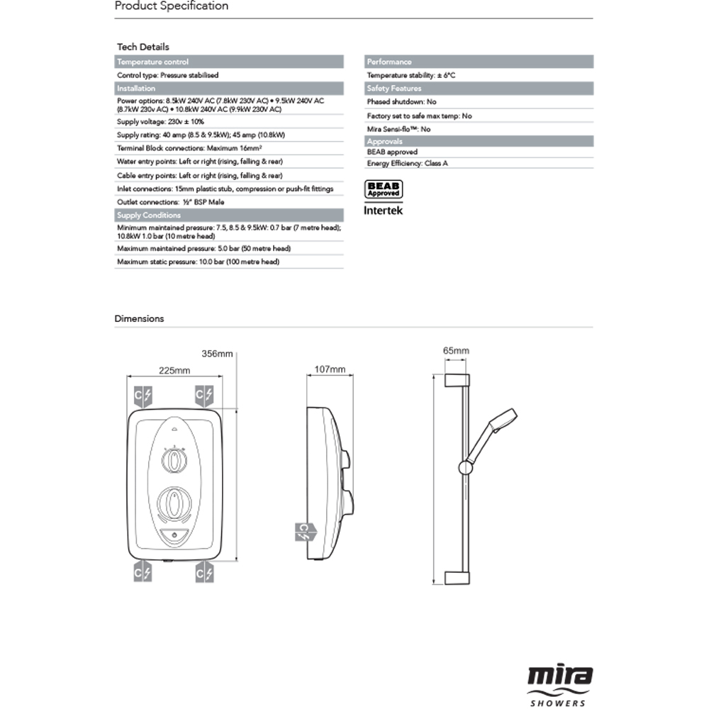 The Mira Jump 9.5kW Electric Shower in white and chrome is a practical and efficient solution for those seeking a reliable and user-friendly shower. Its 9.5kW power output offers a comfortable shower experience, while the simple push-button start and separate temperature and flow controls make it easy to use. The four-spray showerhead with rub-clean nozzles provides a personalized shower experience and effortless cleaning. Featuring Mira Clearscale technology, it minimizes limescale buildup for long-lasting performance. Designed for easy installation with multiple cable and water entry points, the Mira Jump is a versatile choice for replacing an existing shower or fitting into a new bathroom, offering a straightforward upgrade without compromising performance.