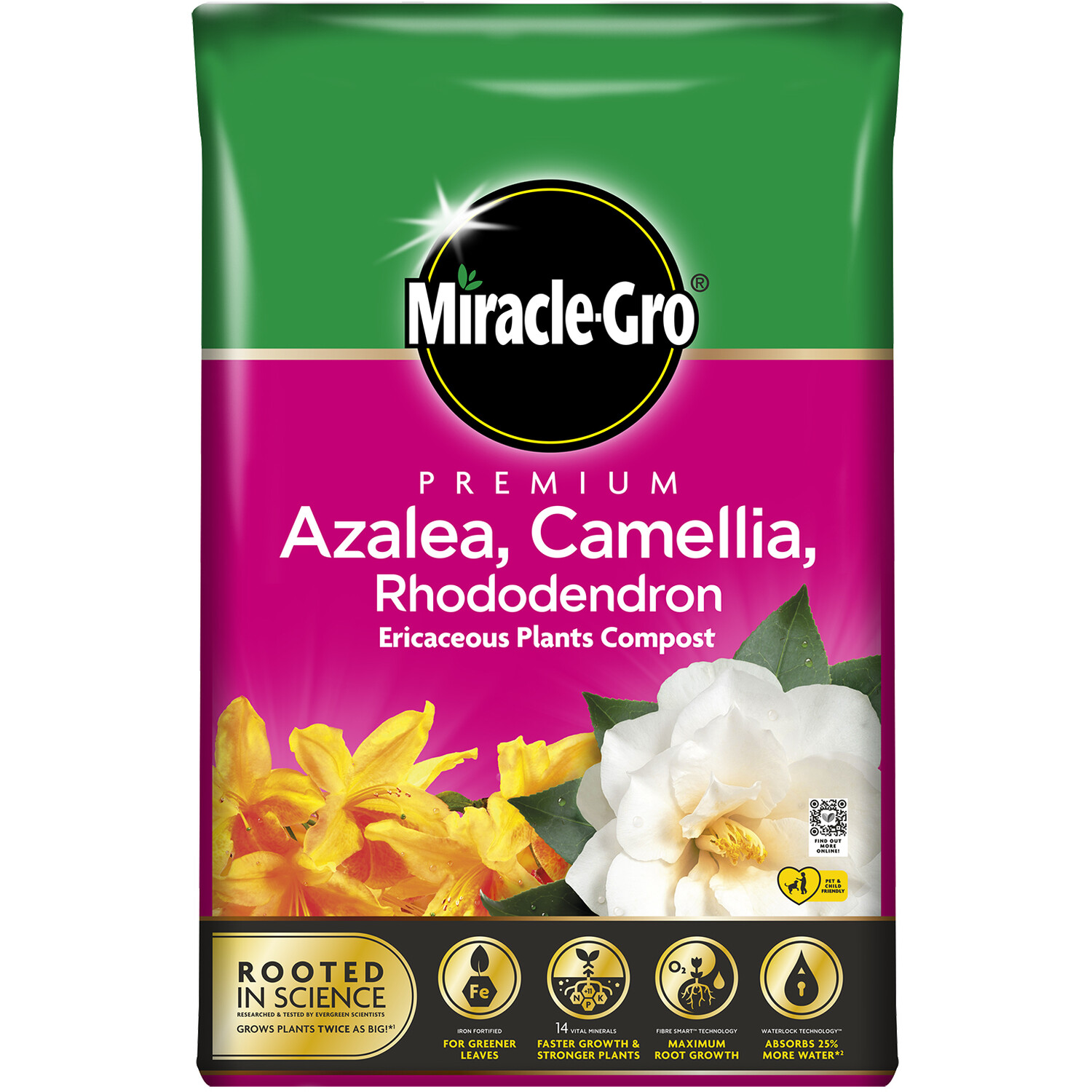 Miracle-Gro's Ericaceous Compost is fortified with iron, a mineral nutrient that is absorbed by roots to resulting greener leaves and healthier bodies. Ideal for Azalea, Camellia, Rhododendron, and other Ericaceous plants, this compost contains a unique, patented Fibre Smart technology; hollow wood fibres ensure the optimum balance of air and water for strong roots to grow healthy. Wood fibres are 100% natural and peat-free, ideal for anyone attempting to keep chemicals out of their garden. This formula; a also contains phosphorous, which is used by plants to help form new roots, make seeds, fruits, flowers and fight disease; potassium to help plants keep strong, as well as nitrogen to bring lots of vibrant green leaves.