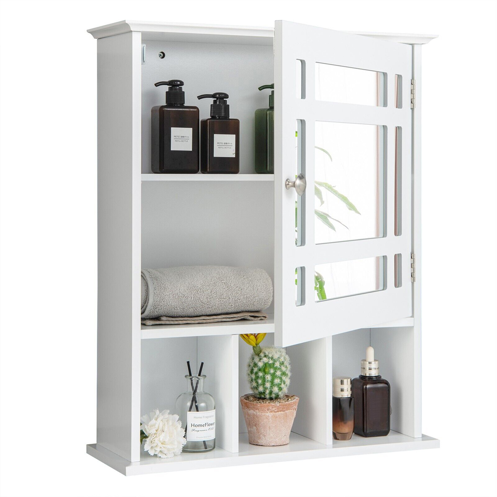 Enhance your space with the sleek and functional Costway White Mirror Door Cabinet 3 Shelf. Designed to fit seamlessly into any room from the bathroom to the kitchen. This elegant wall-mounted cabinet not only serves as a decorative piece but also as a practical storage solution, keeping your essentials tidy, clean, and within reach. With its three open compartments and a mirrored door that conceals two adjustable shelves, this unit offers ample space to organize items like cosmetics, toiletries, and towels while protecting your privacy. The high-quality painted MDF ensures durability and ease of maintenance, making it an ideal choice for any home.