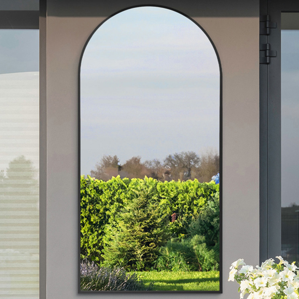 Add a stunning feature to your decor with this MirrorOutlet The Arcus Framed Arched Leaner and Wall Garden Mirror. It features a black metal frame fitted to mirror glass and black all-weather backing to create a stylish yet strong structure. And, it has two keyhole fixings on the back and simply needs to hook onto a screw. Suitable for inside and outside, it's perfect to complement a whole range of decor settings. Size: 200 x 100cm.