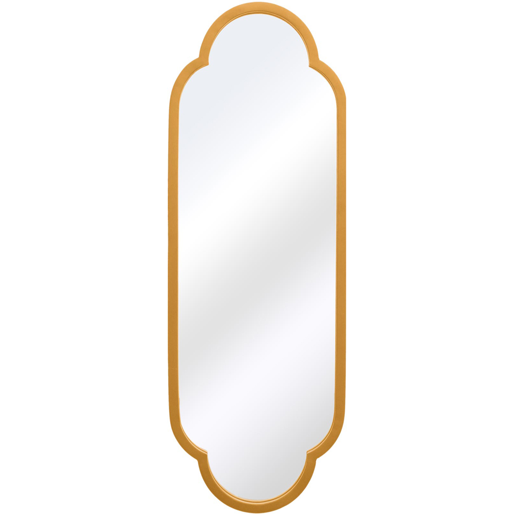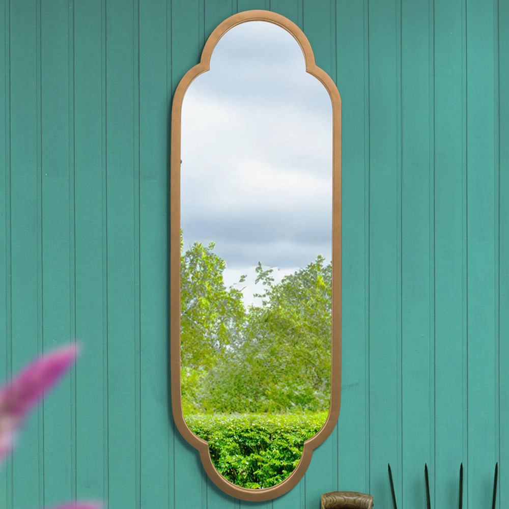 Review your home to a fresh sense of luxury with the MirrorOutlet The Duplici Gold Metal Double Arched Oval Outdoor Wall Mirror 102 x 36cm. It features a gold metal frame that complements its design, making it an eye-catching piece for both indoor and outdoor settings. The mirror glass is securely fitted to a black all-weather backing to withstand elements. Its distinctive double-arched design sets it apart. It provides a substantial reflection surface. For a fuss-free installation, this wall mirror comes with pre-welded keyhole fixings at the back of the frame. All you need is the correct wall fixing to suit your wall type. The delivery is fully insured to make sure that your purchase arrives in perfect condition.