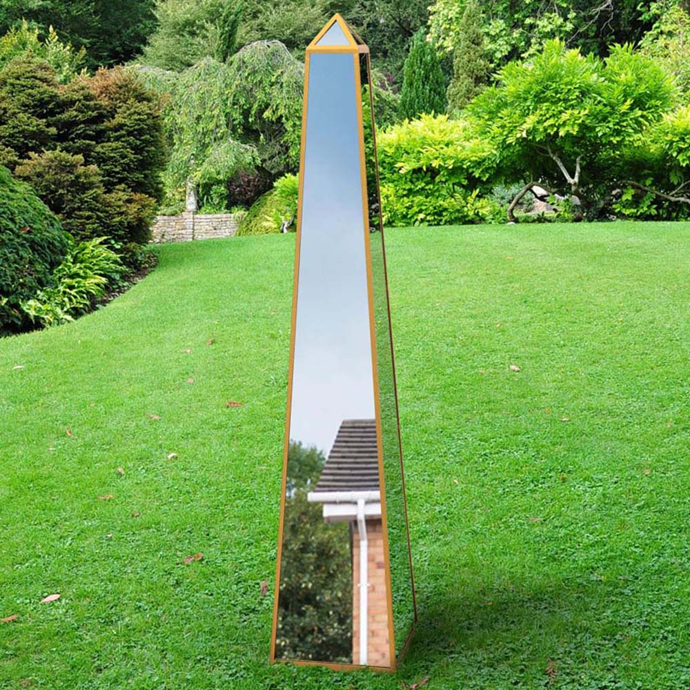 Reflect your home’s style with the MirrorOutlet The Obelisk Gold Metal Edged Mirrored Ornament 150 x 30cm. It is an incredible piece designed to uplift the overall look of any space, both indoors and outdoors. It features a sleek golden metal frame fitted with premium mirror glass. This ornament is crafted to be free-standing, making it adaptable and easy to place anywhere in your home or garden. For added security, this mirrored ornament includes welded brackets at the bottom, allowing you to secure it tightly if desired. Plus, this mirror comes with the assurance of fully insured delivery. Size: 150 x 30cm.
