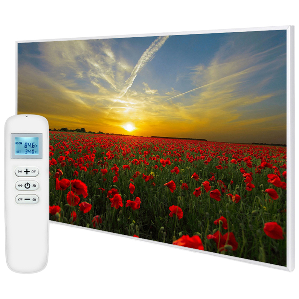 The calming serenity of the sun setting over a field of poppies provides the stunning imagery available on the 795 x 1195mm Setting Sun Printed Infrared Heating Panel 900W. Manufactured by Mirrorstone Heating, the picture is dominated by a myriad of colours, with splashes of red dropped against a sea of green, and the bright yellow sunset against the infinite blue of the sky finishing off this truly beautiful picture.