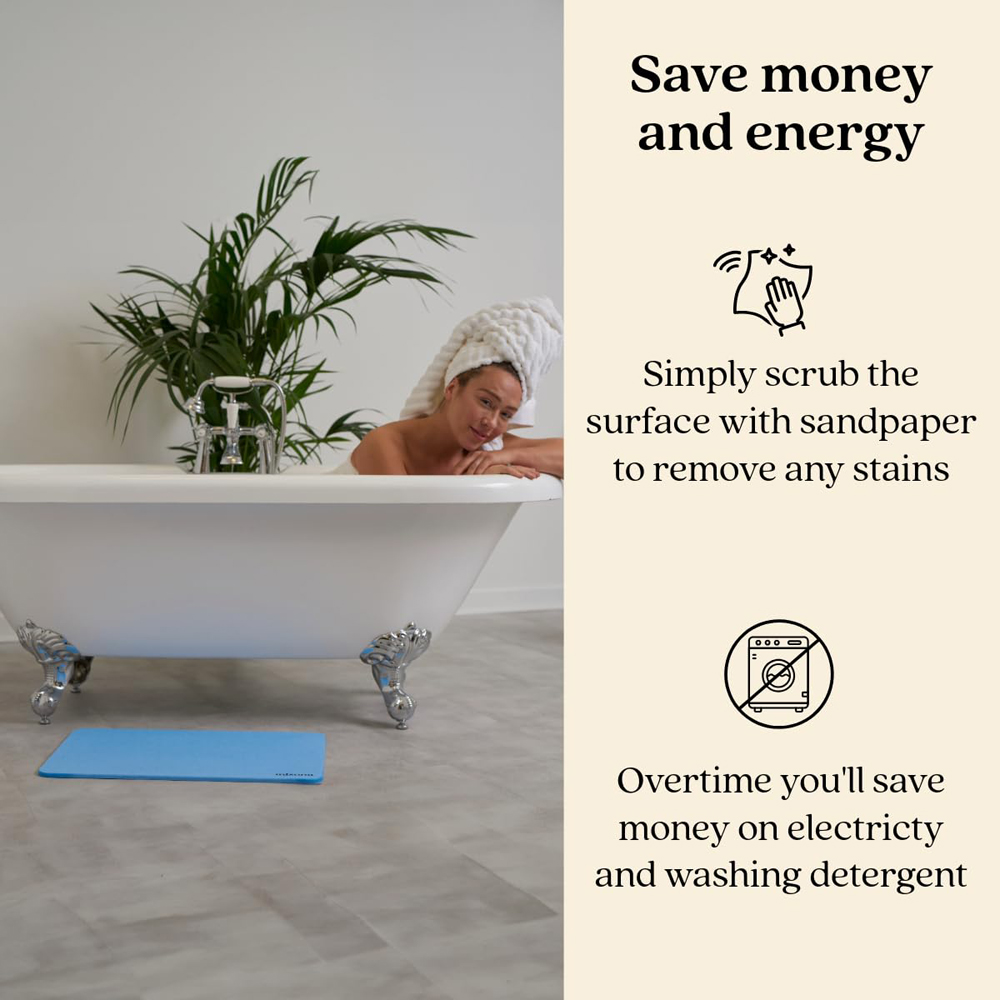From the ground up, this Stone Bath Mat is made from Diatomite, a naturally occurring, soft sedimentary rock. It is super absorbent, so perfect for soaking up water from wet feet. Our bath mat dries quickly - amazingly, it goes from wet to dry in around 60 seconds. But that's not the best bit. What you can save makes this the ideal bath mat for you and the planet. You'll save on electricity, water, and detergent because you don't need to wash or dry it like traditional mats. It's anti-bacterial and odourless too, keeping your bathroom fresher and cleaner.
