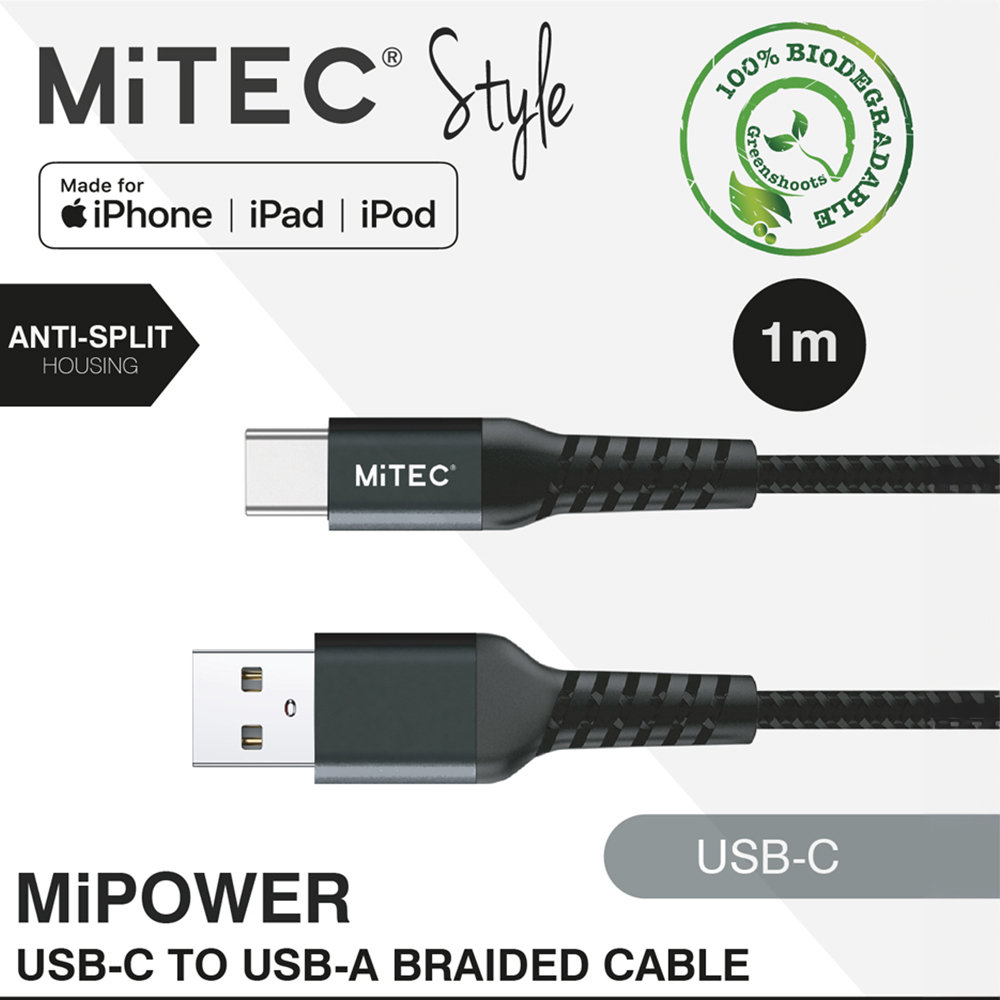 Charge, sync and connect your devices effortlessly with this MiTEC Braided USB-C Cable in black. Ultra-stylish, everyday powering essential, this cable is 1m in length, making it perfect for extended charging usage and data transmission. Simply carry in your bag and power up your device when needed. It is reinforced with anti-split housing at the tip, creating a highly robust and flex-resistant build at the weakest point of the cable. The housing is tested 20000 times and is designed to protect the cable housing as it connects to the plug. The tough, woven exterior helps to prevent splitting, for a more durable and long-lasting casing.