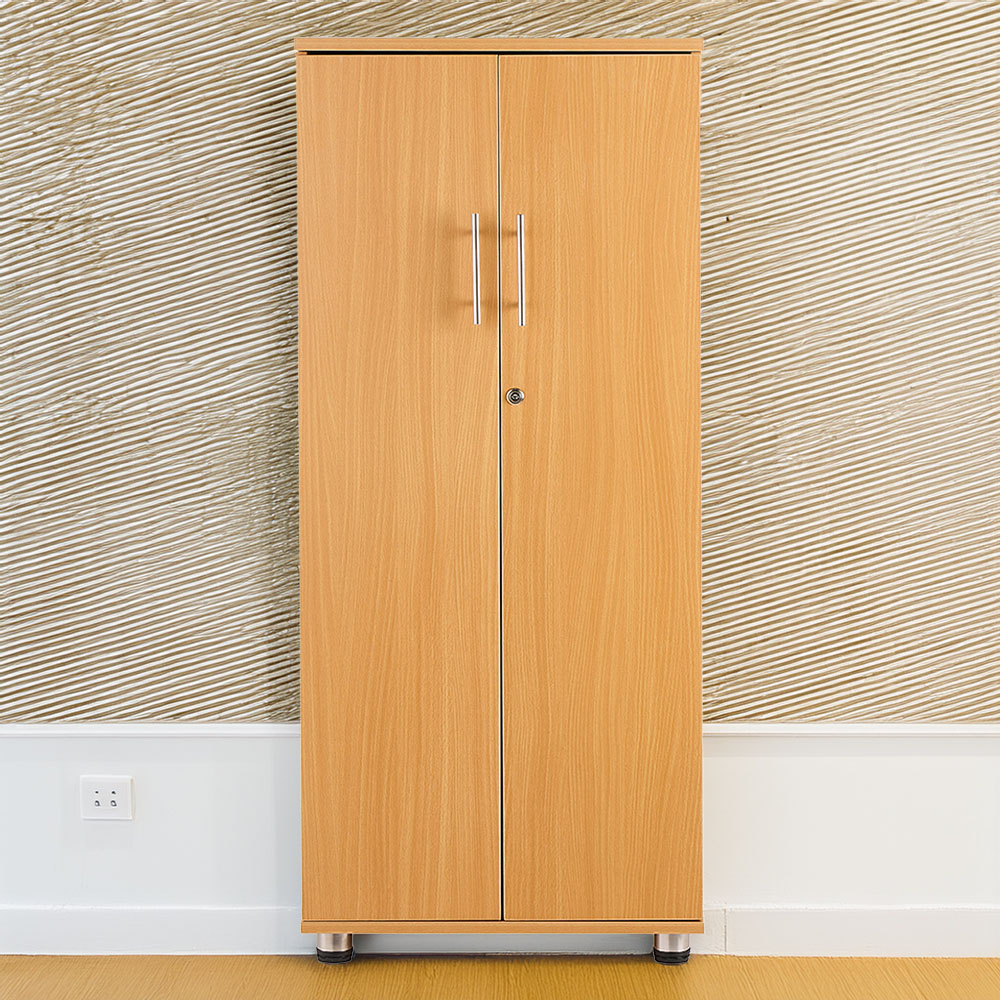 Beech Wooden 3 shelves - 2 Door Lockable Filing Cabinet. Excellent sturdy professional cabinet, lockable, one lock to secure both doors. Easy to assemble, flat pack assembly construction, with easy-to-follow instructions. Want your office to look professionally well-managed? Keep all your materials and supplies safe and organised with this sturdy storage cupboard. Thanks to its functionality and classic design, this 2 Door Storage Cupboard is a great addition to any office, classroom, or other workspace. While most storage cupboards are clunky and hog valuable space, this storage tall cupboard ensures your office area is always neat and contained. Perfect for storing large boxes, briefcases, stationery, box files and various other office supplies. Made of high-quality MDF, this filing cabinet is durable as well as easy to clean and maintain. The 2-door lockable filing cabinet uses a central lock for added safety and security and is supplied with two keys. The assembly process is simple and straightforward. Keep clutter at bay and essential items close at hand with this cupboard. 55cm(w) x 35cm(d) x 125cm(h).