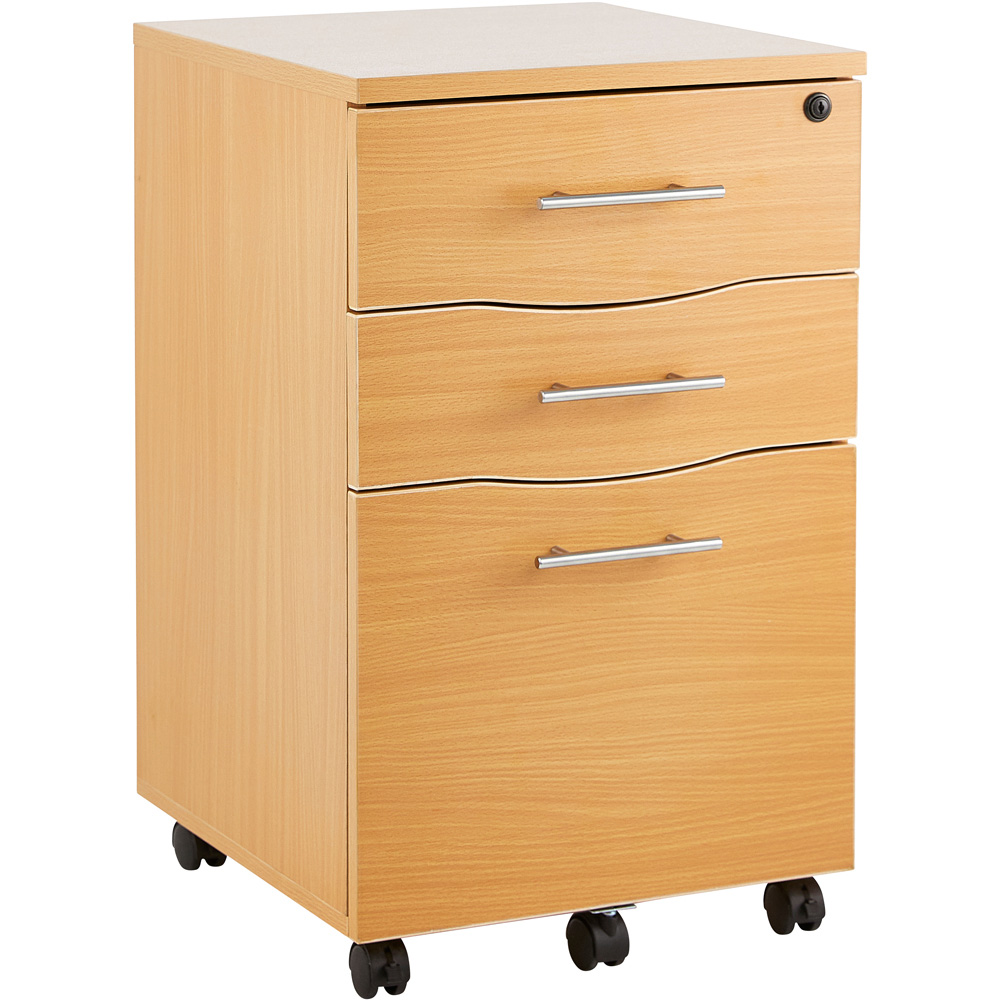 This Beech Wooden Filing Cabinet with three drawers, including one lockable drawer, is a stylish and practical addition to any office, classroom, or workspace. Designed to keep your materials and supplies organised, this sturdy cabinet offers ample space for large boxes, briefcases, stationery, and files. Constructed from high-quality MDF, it combines durability with a classic beech finish, making it both easy to clean and maintain. The lockable drawer provides secure storage for important items, complete with a central lock and two keys for added peace of mind. Easy to assemble with straightforward instructions, this cabinet brings professional organisation and a clean, elegant look to your space. Dimensions: 42cm (w) x 44cm (d) x 68cm (h).