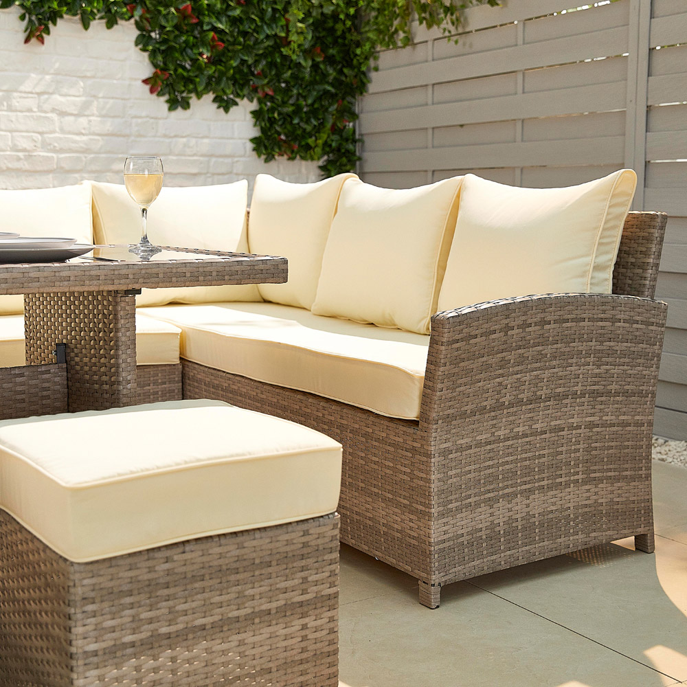 Premium 8-Seater Rattan Corner Dining Set – Fully Assembled with Aluminium Frame Upgrade your outdoor space with this stylish and durable corner rattan dining set, designed for both comfort and convenience. Fully assembled with only the arms to attach, this set is built with a rust-resistant aluminium frame for long-lasting use. Key Features: 8-Seater Capacity – Spacious L-shaped sofa accommodates 5 people, plus 3 footstools for additional seating. Fully Assembled – Arrives pre-built, simply attach the arms and it's ready to use – no flat-pack hassle! Spacious Table – Measuring 140cm (L) x 70cm (W), perfect for outdoor dining and entertaining. Wide Sofas for Extra Comfort – Includes a 3-seater (250cm long) and a 2-seater (190cm long), plus 3 footstools with cushions. Rust-Free and Weather-Resistant – Built with an aluminium frame for superior durability and zero rust issues. Premium Rattan and Cushions – Stylish cream cushions are included for a luxurious seating experience. Convenient Two-Man Delivery – Delivered fully assembled by our trusted home delivery service. Delivery Information: UK Mainland Only – Excludes Isle of Man, Isle of Wight, Channel Islands, and BT postcodes. Customers in these locations must arrange their own courier. This elegant and practical garden furniture set is perfect for family gatherings, summer BBQs, and outdoor relaxation. Simply unpack and enjoy!