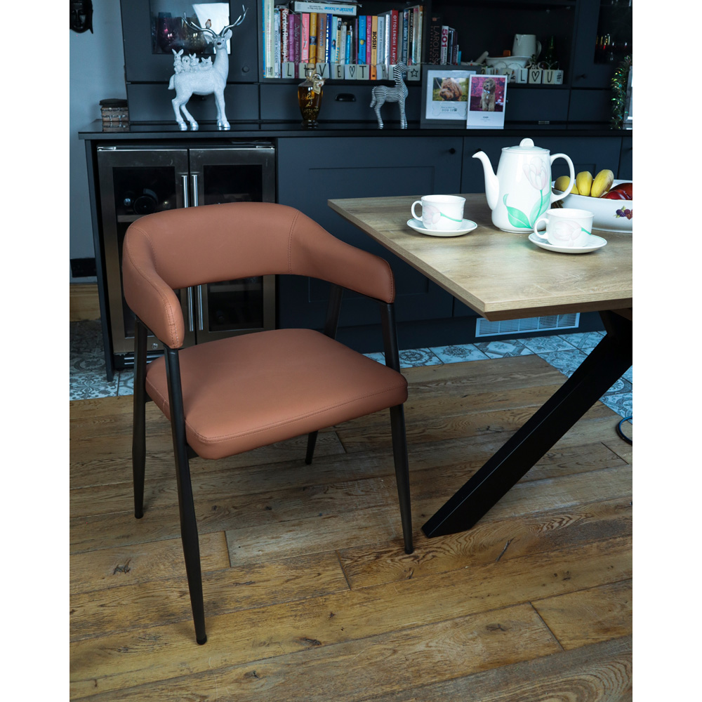 Elegant Living Room Armchairs: These vintage-inspired armchairs for the living room combine timeless style with modern comfort. Perfectly suited as chairs for the living room, these wrap-around armchairs offer a touch of elegance to any living room furniture set. Size 52cm wide x 47.5cm(d) x 76.5cm(h) - see dimension drawing for all the dimensions. Stylish Dining Chair Set: This dining chair set of 2 features a tan tone, easily complementing any dining table and chair ensemble. Designed for comfort and durability, these dining room chairs provide an inviting space for family meals. Versatile Dining Chairs Set: These dining chairs set of 2 are perfect for a dining table and chairs set 2 arrangement. With a vintage flair and tan colour, they serve as ideal dining chairs for any kitchen or dining room. Comfortable Arm Chair Design: Crafted with leisure in mind, these armchairs offer a comfy experience with their plush seating and wrap-around support. Ideal as kitchen chairs or as accent chairs in living room settings, they elevate any space. Sophisticated Living Room Chairs: Enhance your interior with a living room chair set of 2, featuring a vintage wrap-around design and making them versatile chairs for dining room and living areas alike.