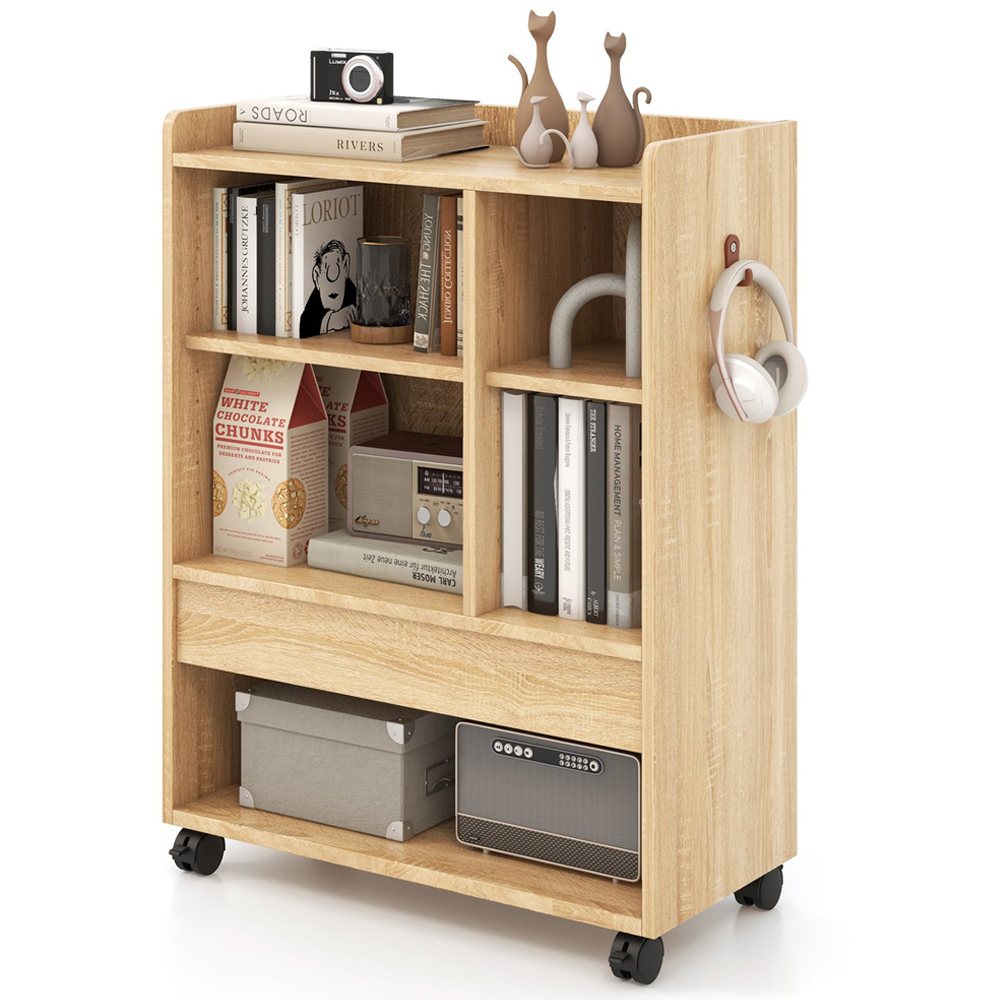 Effortlessly organise and enhance your space with the Costway Single Drawer 6 Shelf Natural Mobile Storage Cabinet with Hooks. This modern storage cabinet is perfect for displaying ornaments and storing frequently used items with ease. It offers two adjustable shelves that can be modified to accommodate items of varying sizes, from large books to small decorative pieces. The inclusion of a deep drawer, bottom shelf, and two convenient hooks further expands its functionality. Designed for both stability and mobility, the cabinet is equipped with four casters, two of which are lockable to ensure it stays in place when needed. Built to last with a thickened board and premium edge-sealing, this cabinet is a practical addition to any room, be it a living room, bedroom, study, or office.