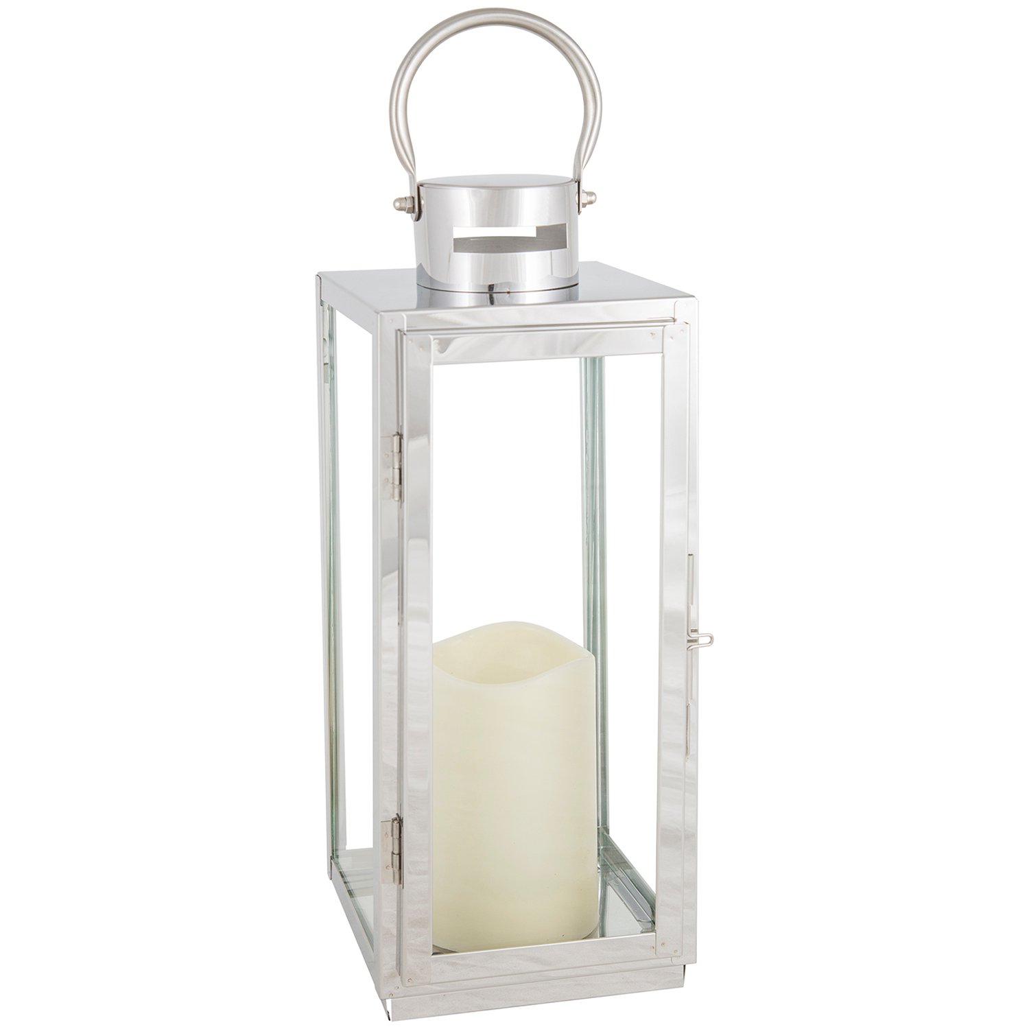 The perfect contemporary light feature for your home, this Modern LED Stainless Steel Lantern is designed with four glass panels and a modern silver structure. The battery-powered LED flickers like a real candle, illuminating your space with its cosy and atmospheric glow.
