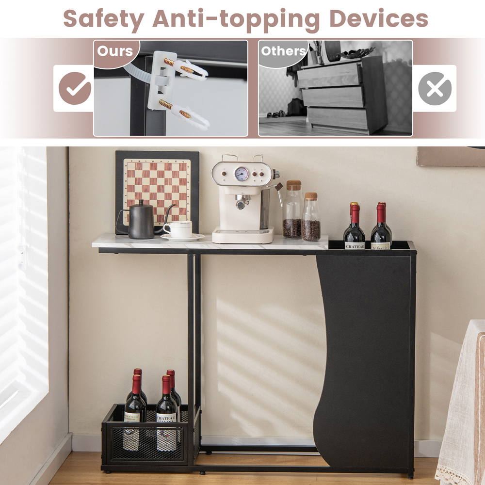 Elevate your living space with the chic and functional Costway Black and White Marble Console Table with 2 Mesh Storage that exude elegance atop a sophisticated black metal frame. This versatile piece not only enhances your decor but also offers practical storage solutions with two mesh storage cubes and ample tabletop space for your decorative items or photo displays. Whether used in the entryway, besides your sofa, or as a stylish plant stand on your balcony, this console table ensures stability and safety with its anti-toppling devices and adjustable legs, making it a reliable choice for any home.