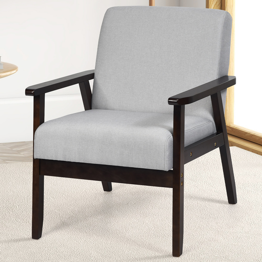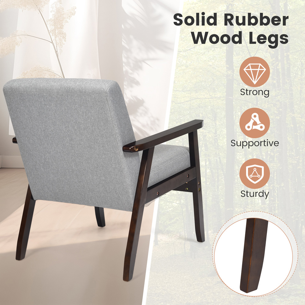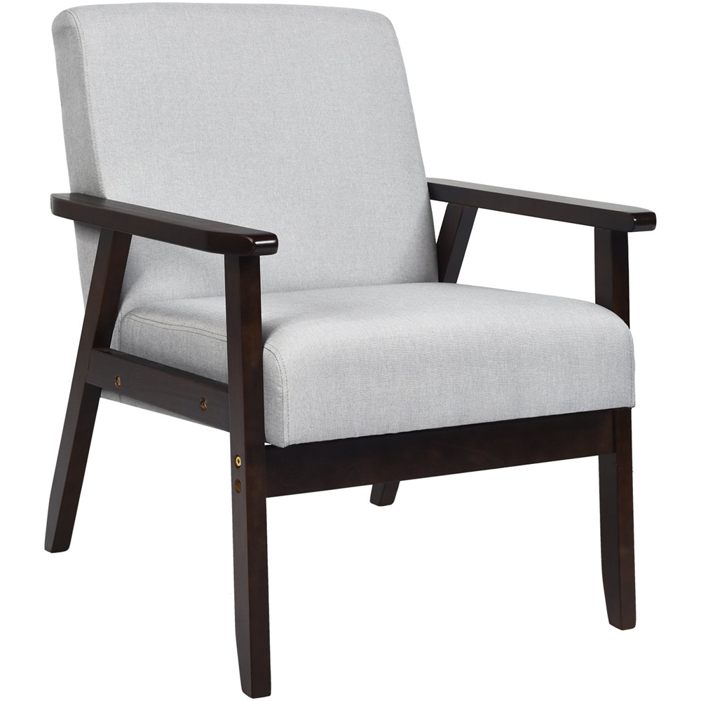 Elevate your living space with the Costway Light Grey Linen Fabric Upholstered Accent Sofa Chair. This chair boasts a modern style that enriches your home's design, whether placed in the bedroom or living room, adding a simple yet elegant atmosphere. Crafted with a high-density sponge, the padded seat and backrest ensure long-lasting comfort without discomfort. Its solid wood construction not only enhances stability but also offers remarkable wear resistance for enduring use. The ergonomic design supports your spine and hips, alleviating fatigue from prolonged sitting, while the roomy seat and armrests offer additional relaxation. Whether you're reading, watching TV, or just resting, this versatile accent armchair integrates seamlessly with any furniture style, making it an ideal choice for various settings including the living room, bedroom, or office.