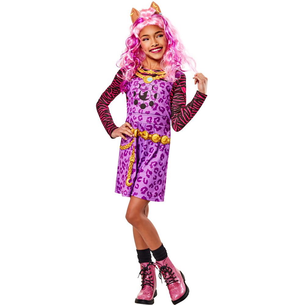 Get ready to transform into the fierce and fabulous Clawdeen with this Rubies Masquerade Kids Monster High Clawdeen Wolf Costume Large. Perfect for imaginative play and costume events, this dress makes your child look confident and stylish, like the character from Monster High. The detailed top with long sleeves is made mostly from purple fabric and features a wolf design on the front. It's perfect for all dress-up occasions, including Halloween. The costume has undergone comprehensive safety testing where applicable, meeting all relevant regulations.