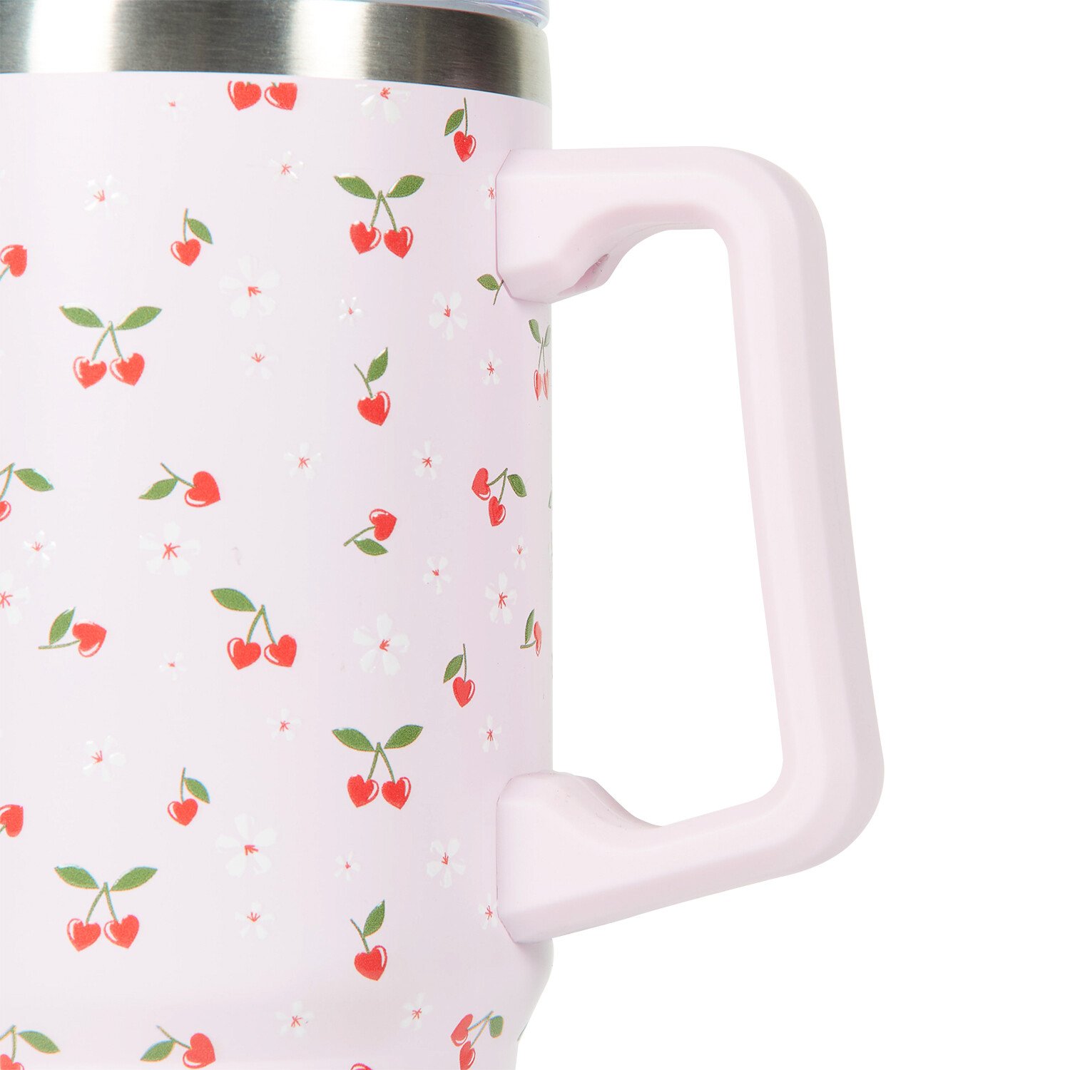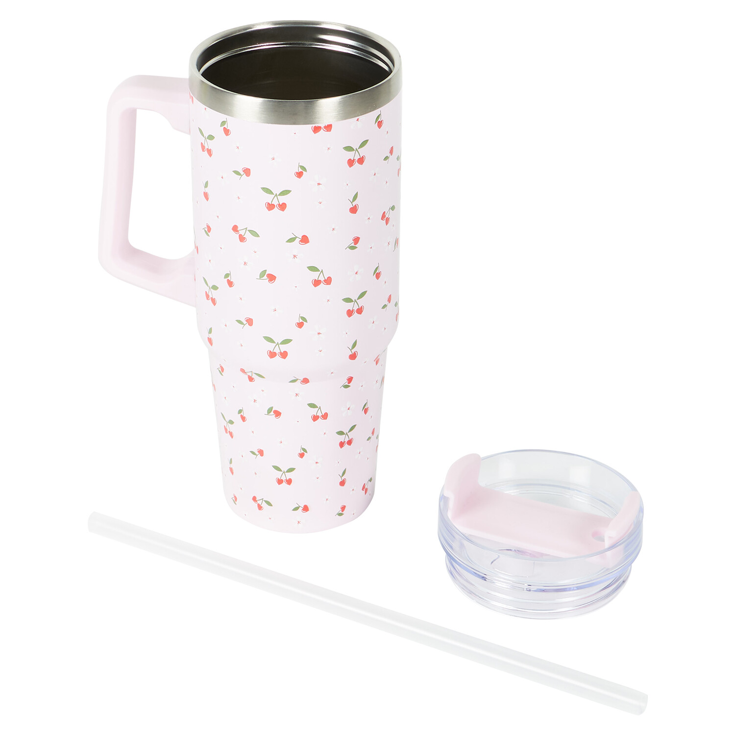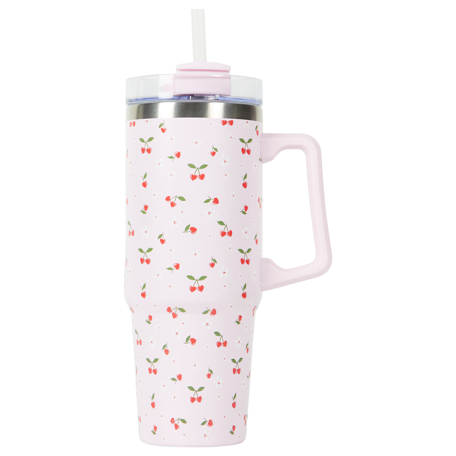 Sip your drinks in style using this Mon Cheri Jumbo Tumbler 850ml. This stainless steel tumbler with lid and straw features adorable heart-shaped cherries and is perfect for Valentine's Day. The lid can be adjusted to drink through the straw or mouthpiece as per your convenience. Compact and simple to carry, the tumbler fits in most car cup holders and is finished with a twin-wall vacuum to keep your drinks cool or hot for longer.