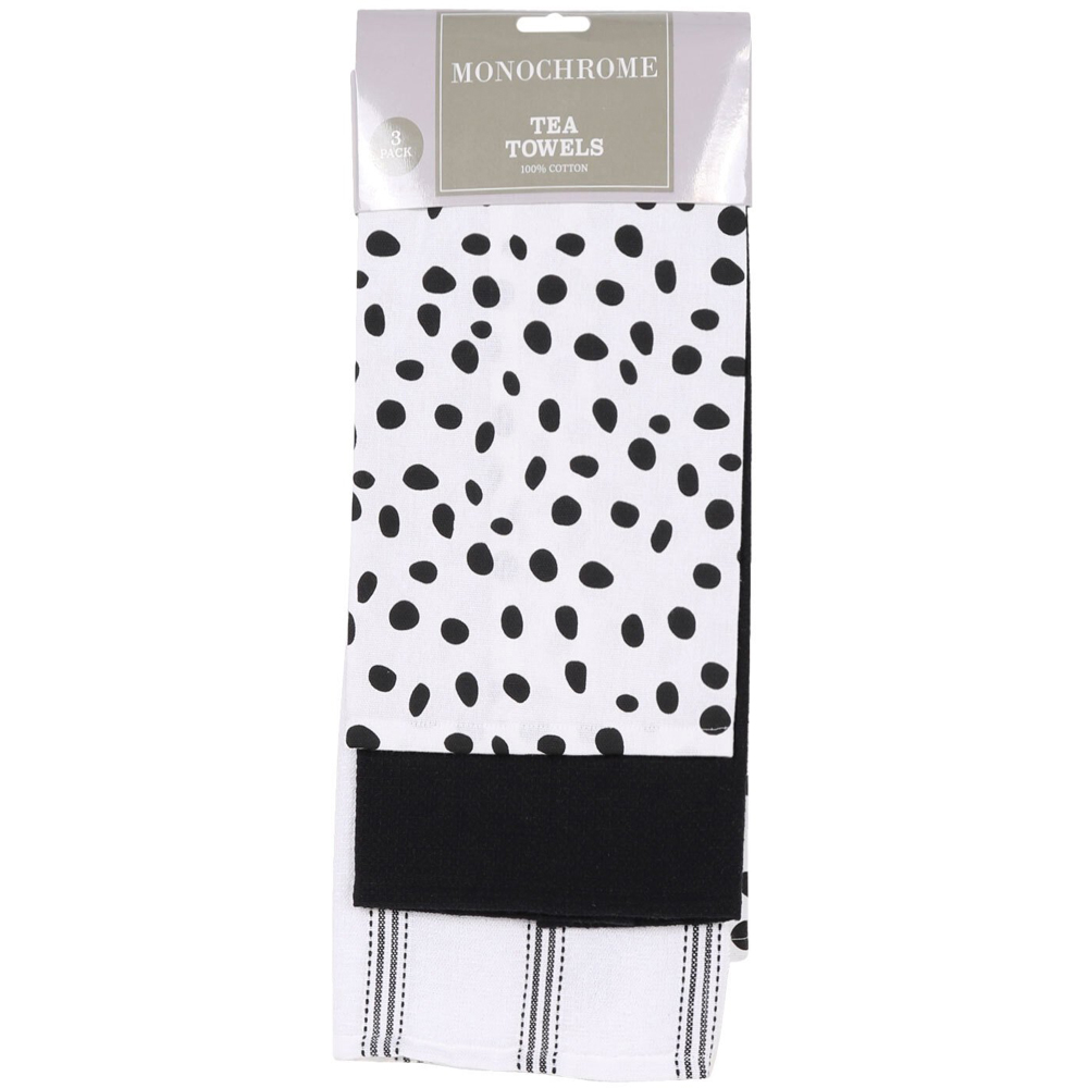 Snazzy and modern, the Pack of 3 Monochrome Tea Towels includes one towel with dalmatian spots all over, one white towel with vintage stripes, and one solid black towel. Woven from cotton, these absorbent towels will help you with your daily drying up.