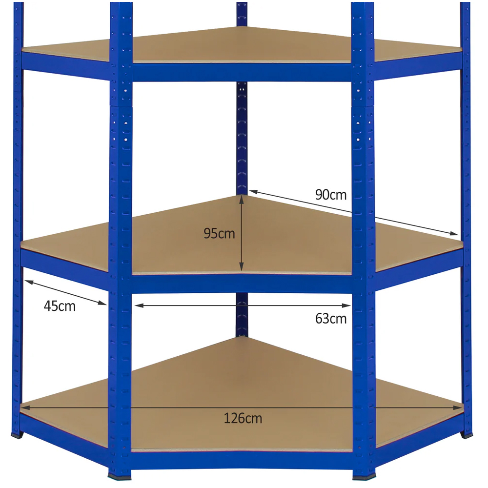 De-junk your garage and get organized with Monster Racking T-Rax Corner Storage Shelf Unit Blue 90cm. Maximize space in your shed or garage with this brilliant corner unit, designed to fit snugly in any corner. Use it as a standalone unit or combine it with other T-Rax racking bays for even more storage. Each shelf can hold a whopping 265kg of evenly distributed weight, and the solid MDF boards are adjustable, providing versatile storage for tools, stock, and much more. Like all our garage racking, the T-Rax corner unit can be broken down into two workbenches. The simple boltless design makes assembly a breeze—all you need is a rubber mallet, which is included when you buy three or more bays. Each shelving unit measures H180 x W90cm x D45cm and features strong storage shelves with five shelves per bay, solid MDF boards, moulded feet for extra sturdiness, and adjustable shelf heights. The thick heavy-duty steel with a powder-coated blue finish ensures durability. The corner T-Rax shelving dimensions are H180 x W126 xD95cm (front to back), 126cm in width (widest points), 63cm in width (front), 45cm in depth (shortest side), and 90cm in depth (longest side).