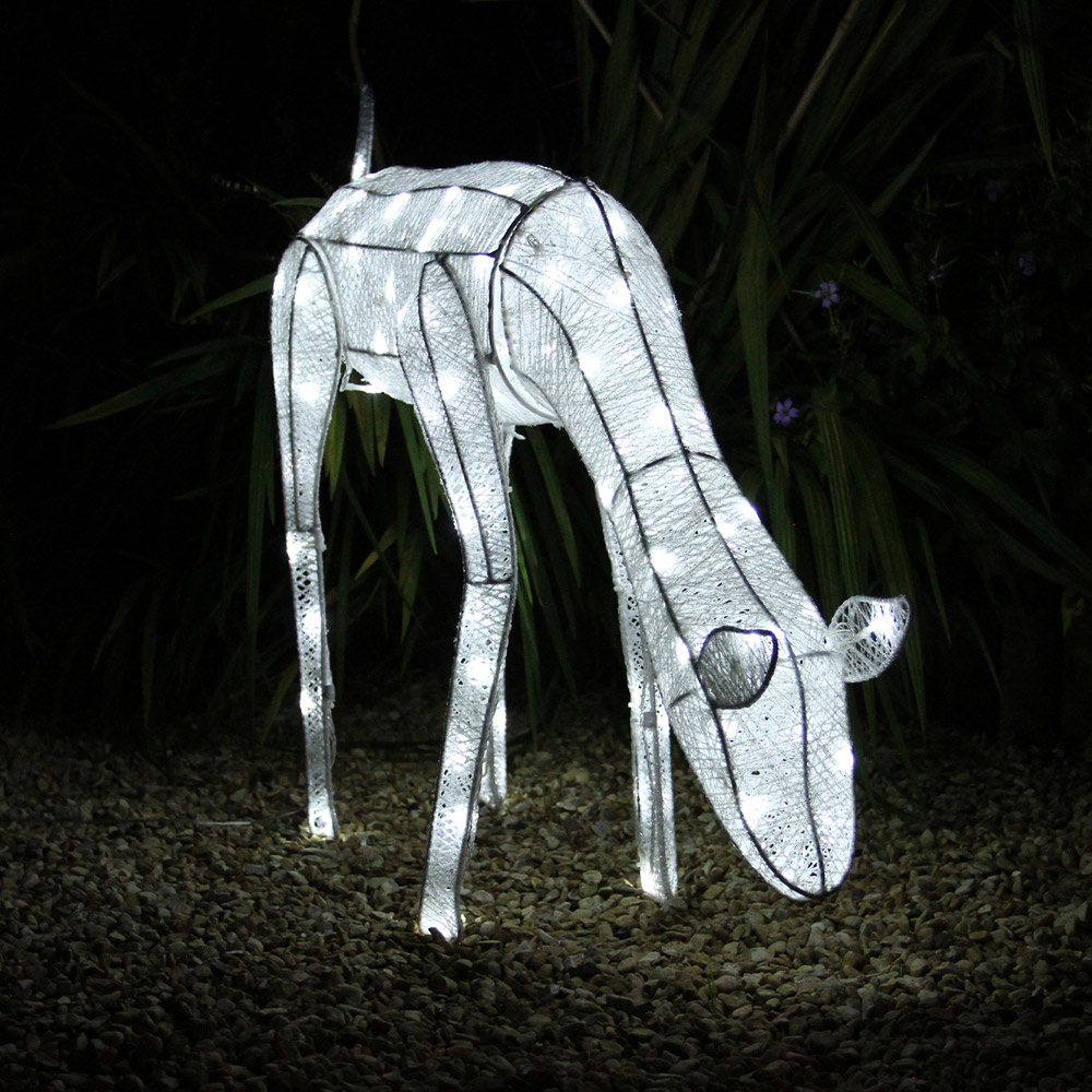 Get ready to elevate your holiday decor with the Monster Shop 61cm LED Grazing Doe Reindeer Outdoor Christmas Decoration. Capture the magic of a winter wonderland with this exquisite grazing doe decoration. Its snow-white body and graceful pose exude elegance, adding a touch of sophistication to your seasonal decor. Each detail is meticulously crafted, with glitter cotton spun by hand onto the iron frame, creating a mesmerizing sparkle that shimmers beautifully in the festive light. Featuring 120 ice-white LED lights, this enchanting doe emanates a stunning, frosty glow, illuminating your winter nights with a captivating charm. With an extra-long 12m clear power cable, you have the flexibility to position this sparkling masterpiece wherever you desire. Rest assured, the doe is designed to withstand classic winter weather conditions, and it comes with a fixing kit and IP44 protection for added security and durability. Dimensions: H61 x W22 x L80cm.