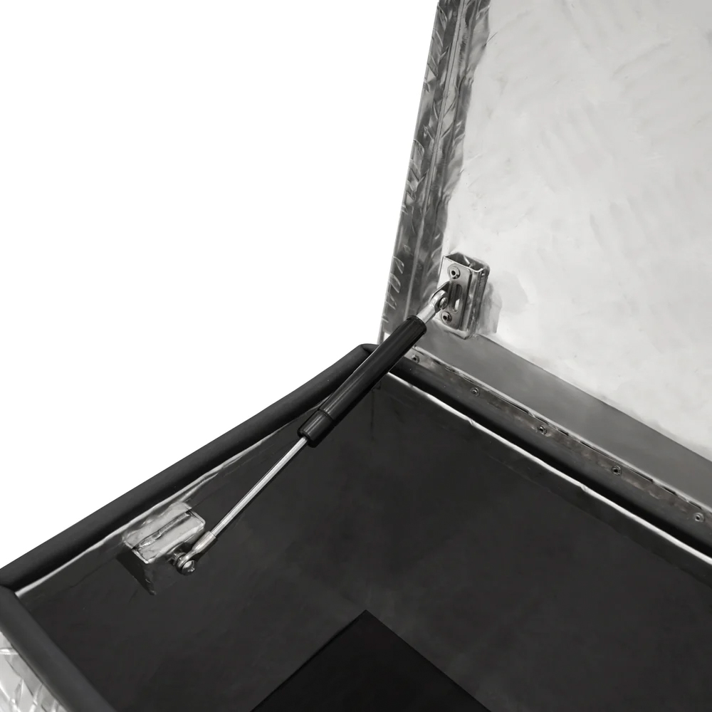 Upgrade your tool storage with this heavy-duty Monster Shop Aluminium Extra Large Tool Box. It's designed to offer exceptional functionality and security for professional tradespeople and DIY enthusiasts. With a generous 102-litre storage capacity, this versatile toolbox is suitable for various applications. Ideal for fastening onto trailers or the back of pickups this toolbox is perfect for securely storing tools straps and coupling locks providing you with peace of mind wherever you go. Being constructed from a 1.5mm aluminium checker plate, this toolbox is engineered for maximum strength and durability. Its fully waterproof design complete with a rubber seal around the lid and opening prevents water and dirt from entering ensuring all items inside remain clean and dry. The robust welded construction further enhances its durability making it a reliable companion for tough environments. It is fully lockable and comes with two keys providing maximum protection for your valuable tools and accessories. For effortless access, it also features a hinged lid equipped with two gas struts ensuring smooth and easy opening. Inside a rubber base lining keeps your items securely in place during transit preventing any movement or damage. Whether you're a professional or an enthusiast, it'll help you stay organised and efficient so you can focus on getting the job done. Colour: Silver. Dimensions: H37 x W81 x D35cm. Weight: 7.75kg