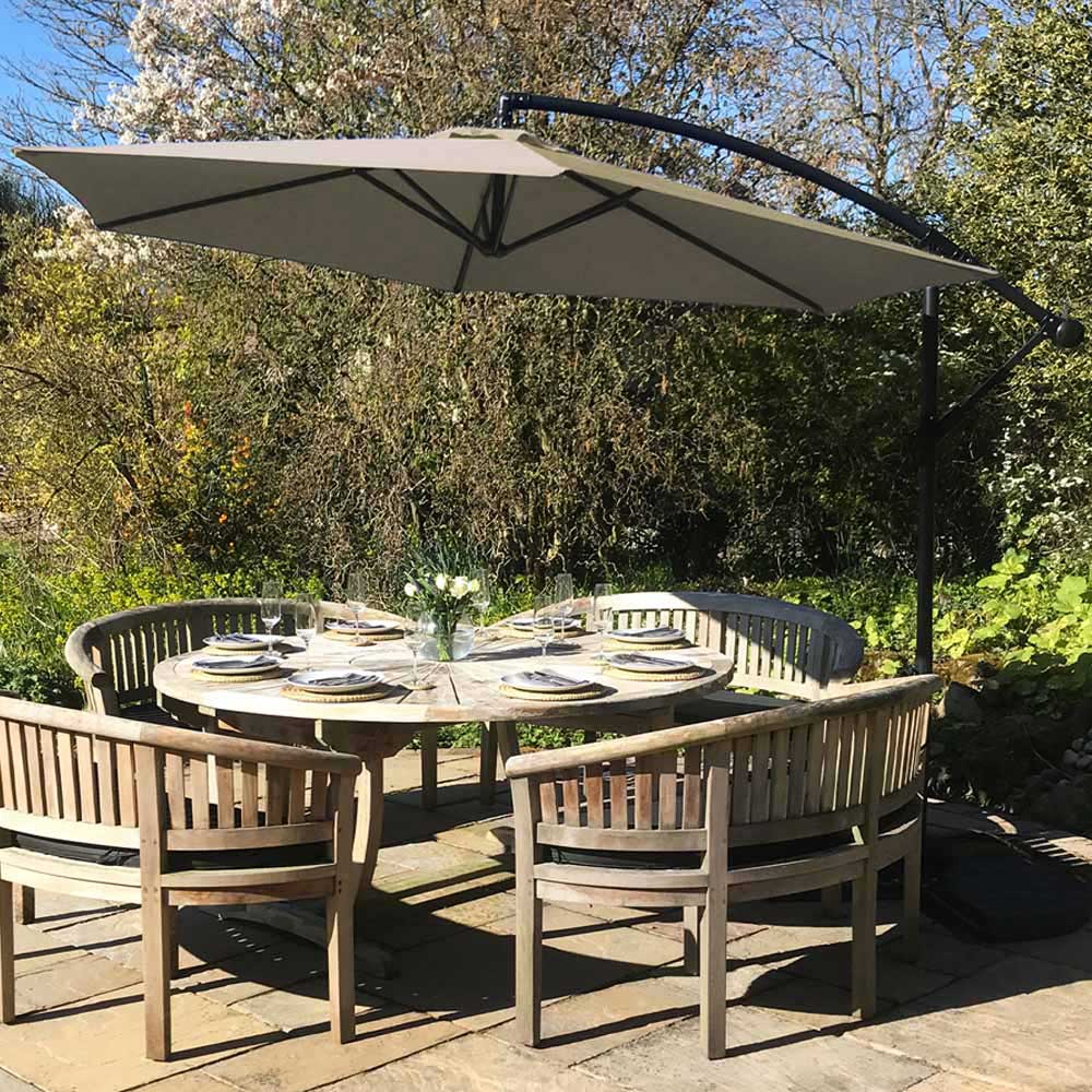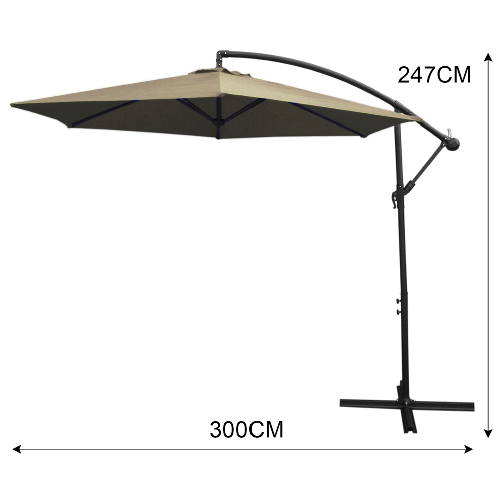 Get summer ready with the beautiful Monster Shop 3m Beige Cantilever Parasol. Stylish and practical, this parasol is a stunning addition to your garden that provides excellent UV protection with high-quality 160g polyester. Featuring a crank winding mechanism, you can have your parasol up in a flash to make the most of sunny days. Then simply tilt to the perfect angle to give you the cover you need. With the stand to the side, this attractive parasol will complement any outdoor furniture. It includes a free waterproof cover that helps to keep the parasol in tip-top condition all year round. Specifications: Weight: 11.1 kg. Material: 160g Polyester and Powder Coated Iron. Number of Spokes: 6. Iron Thickness: 0.9mm. Pole Diameter: 48mm. Looking for a way to keep your parasol secure and protected and enjoy some shade? Check out our selection of parasol bases, designed to keep your parasol in place while you relax and parasol cover to keep them protected.