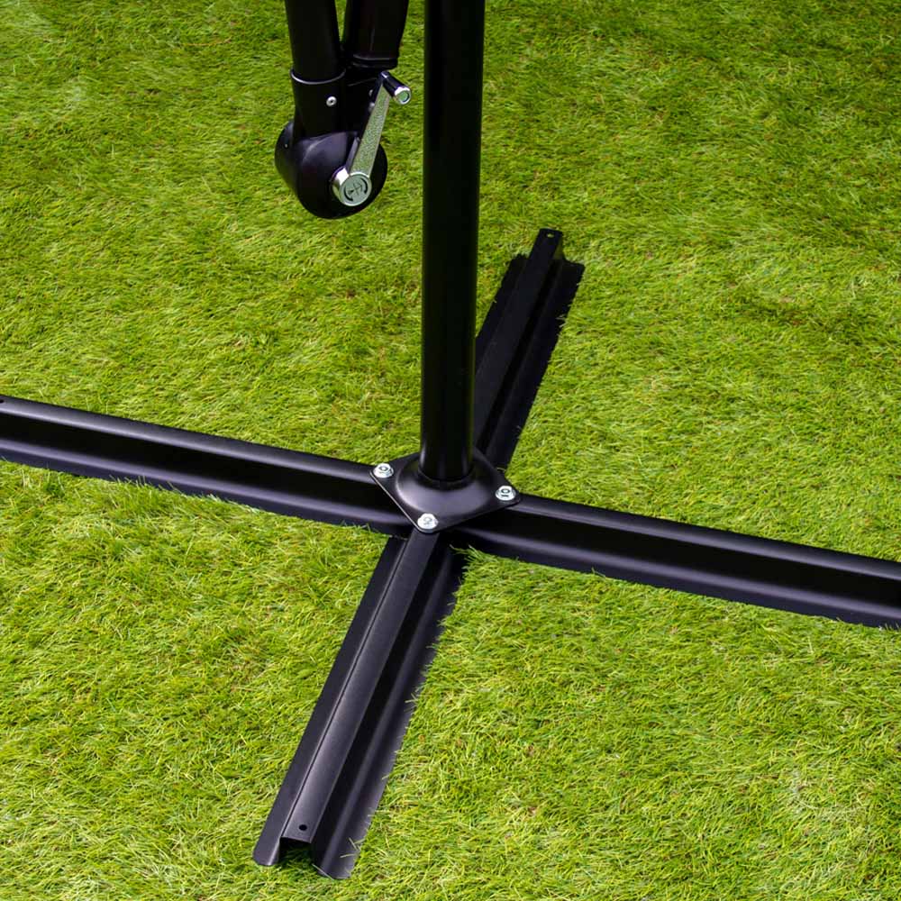 Get summer ready with this beautiful Monster Shop 3m Beige Cantilever LED Parasol. Stylish and practical, this parasol is a stunning addition to your garden that provides excellent UV protection with high quality 160g polyester. Featuring a crank winding mechanism, you can have your parasol up in a flash to make the most of sunny days. Once erect simply tilt to the perfect angle to give you the cover you need. Also, the parasol permits users to rotate it to a full 360 degrees for easy shading control throughout the day as the sun moves. With a hanging style, this parasol leaves the standout of the way allowing you to make the most of your shaded area. For ventilation and proper air circulation, the parasol also comes with a discreet cent at the top to let air inside and reduce wind pressure. Beautifully crafted, each rib off the parasol is decorated with four cool white solar-powered LED lights to keep your summer evenings illuminated in an eco-friendly and economical way. Apart from this, you can use the built in on/off switch to quickly light up your parasol for hassle-free outdoor use. Made from durable powder coated carbon steel and with a 48mm thick pole, this parasol is extremely sturdy and is sure to stand the test of time. Easy to place, its cross-section bottom allows the cantilever to stand freely but for safe anchoring always pair it with fillable bases. In addition, the CE-certified parasol comes with a free waterproof rain cover to keep it maintained all year round. The pack includes one LED parasol, a waterproof cover and an instruction manual. Number of Lights: 24. LED Power Rating: 0.2W. Weight: 11.9kg. Size: 2.45 x 2.98 x 2.98m. Looking for a way to keep your parasol secure and protected and enjoy some shade? Check out our selection of parasol bases, designed to keep your parasol in place while you relax and parasol cover to keep them protected.