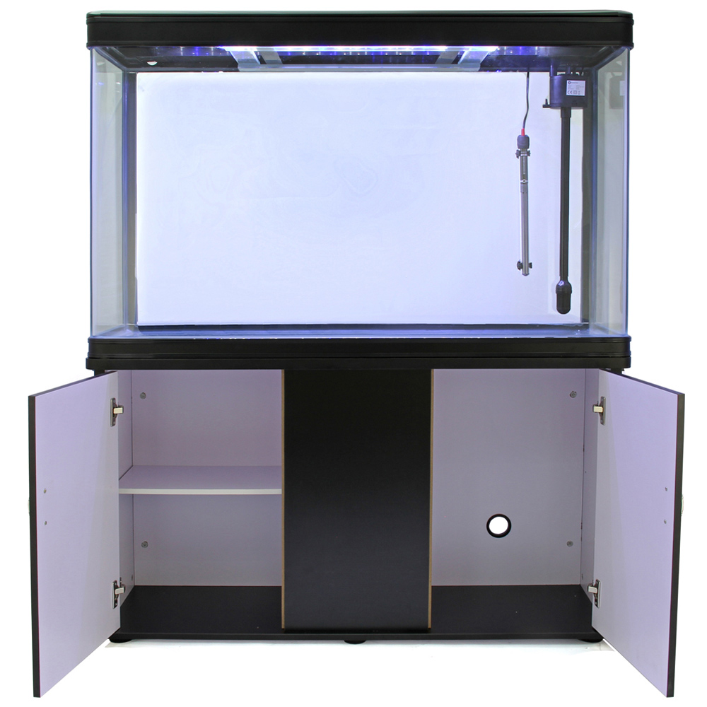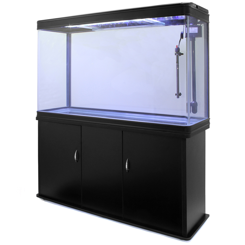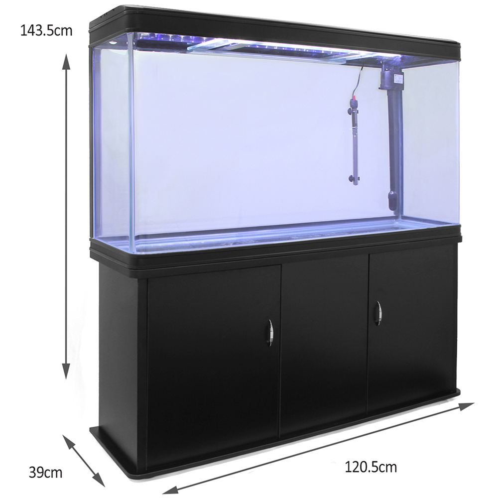 Add a beautiful decoration for your home with MonsterShop Black Fish Tank and Blue Gravel. It comes with a stylish matching matt black cabinet underneath, with plenty of room to store your supplies within the two-door space. The aquarium itself features a lovely black trim and an incredible curved glass exterior. With 11mm thick glass - it gives you perfect transparency and a 180 degrees view of your beloved fishy friends. Measuring 120.5cm x 39cm x 143.5cm (H x D x W) - this diverse aquarium can house freshwater, tropical or marine fish thanks to its handy built-in filter, air pump, and a detachable 300W heater. The look is completed with gorgeous LED lighting within the lid of the tank. The lid also features gaps for hoses and cables if necessary. Deck out your fish tank with a whopping 25kg bag of gravel and a huge tree root ornament. These are beautifully complimented by three artificial plants and a reversible background to add to the decor. The fish tank comes with a free 12-month electrical warranty.