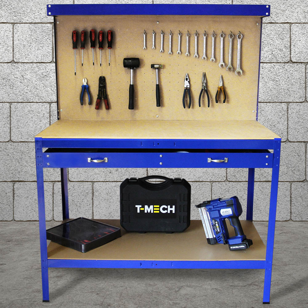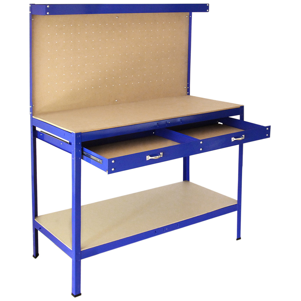 Make a practical addition to your workspace with this Monster Shop Blue Workbench with Pegboard. Featuring 40 free hooks, this workbench gives you plenty of space to hang your must-have tools. With enough storage space, the unit can hold 40kg worth of equipment in the handy and includes a full-length drawer located underneath for bits and bobs. Apart from this, it also has a top shelf that can hold 30kg, a bottom shelf capable of holding up to 100kg and a main work area with a massive 200kg weight holding capacity. Easy to fix, this heavy-duty workbench ensures quick assembly with the free rubber mallet included. Pegboard Thickness: 3mm. Weight: 25kg. Size: 155 x 120 x 60cm.