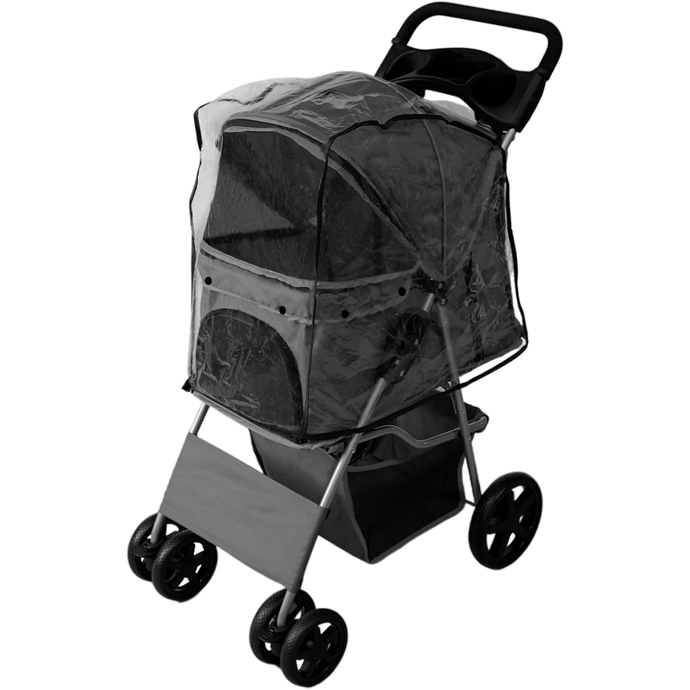 Experience the perfect outdoor companion for pet owners with this practical pet stroller! This innovative stroller is designed to provide the ultimate comfort and convenience for both you and your pet. Crafted with a sturdy steel frame, this pet stroller offers superior strength and security. It's capable of supporting pets weighing up to 15kg. This robust construction supports its longevity and ensures your pet's safety during every outing. The stroller features a foldable design, allowing seamless storage and effortless transportation. Never worry about the unpredictable weather thanks to the stroller's fold-out canopy and included rain cover. This thoughtful duo ensures your pet stays comfortable in any weather. The canopy provides shade on sunny days, protecting your furry friend from intense sunlight, while the rain cover acts as a shield during unexpected downpours, keeping your pet dry and snug inside the stroller. Manoeuvring the stroller is effortless, thanks to the 2 x 8 inches rear wheels equipped with brakes and the 4 x 6 inches front swivel wheels. Whether you're strolling through parks or on bumpy terrain, these wheels provide a smooth and secure ride for your pet. The foam-covered handle adds an extra layer of comfort, ensuring a pleasant grip and control during your adventures. The strategically placed ventilation windows ensure continuous airflow, keeping your pet cool and comfortable during the ride. These windows not only provide fresh air but also offer your pet a chance to observe the surroundings. Additionally, the stroller comes with a removable cushion. This allows you to easily clean the cushion and maintain a hygienic environment for your pet while giving them a plush space to rest. Includes a convenient snap hook to attach to your pet's collar, providing you with complete peace of mind while you enjoy your walks. A generously sized basket at the base offers ample space to stow your pet's necessities – treats, toys, and water bowls – alongside your personal items like keys and wallets. Plus, with the added convenience of a secure cup holder, your beverages are always within reach, allowing you to enjoy a mid-walk refreshment. No more juggling bags and cups – everything you need is right at your fingertips, ensuring a stress-free and comfortable outing. Create unforgettable memories on your outdoor adventures, ensuring your pet travels in style, comfort, and security with these foldable pet strollers.