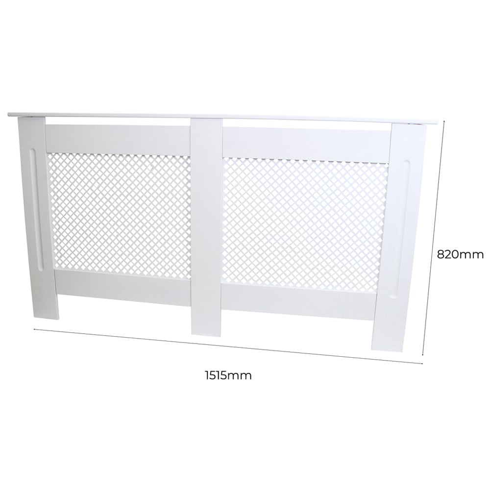 Add a simple, attractive, and modern touch to your home while fully concealing radiators without losing any of the heat with Monster Shop White MDF Radiator Cover 1515mm. It protects children and pets from hot radiators. It even acts as a shelf, freeing up more space for displays or ornaments without excess clutter. Lightweight and durable, this high-quality MDF won’t let you down. It also comes with a free flexible cleaning brush so you can dust off those harder-to-reach places easier than ever. Dimensions: 1515mm W x 820mm H x 188mm D. Weight: 12kg.