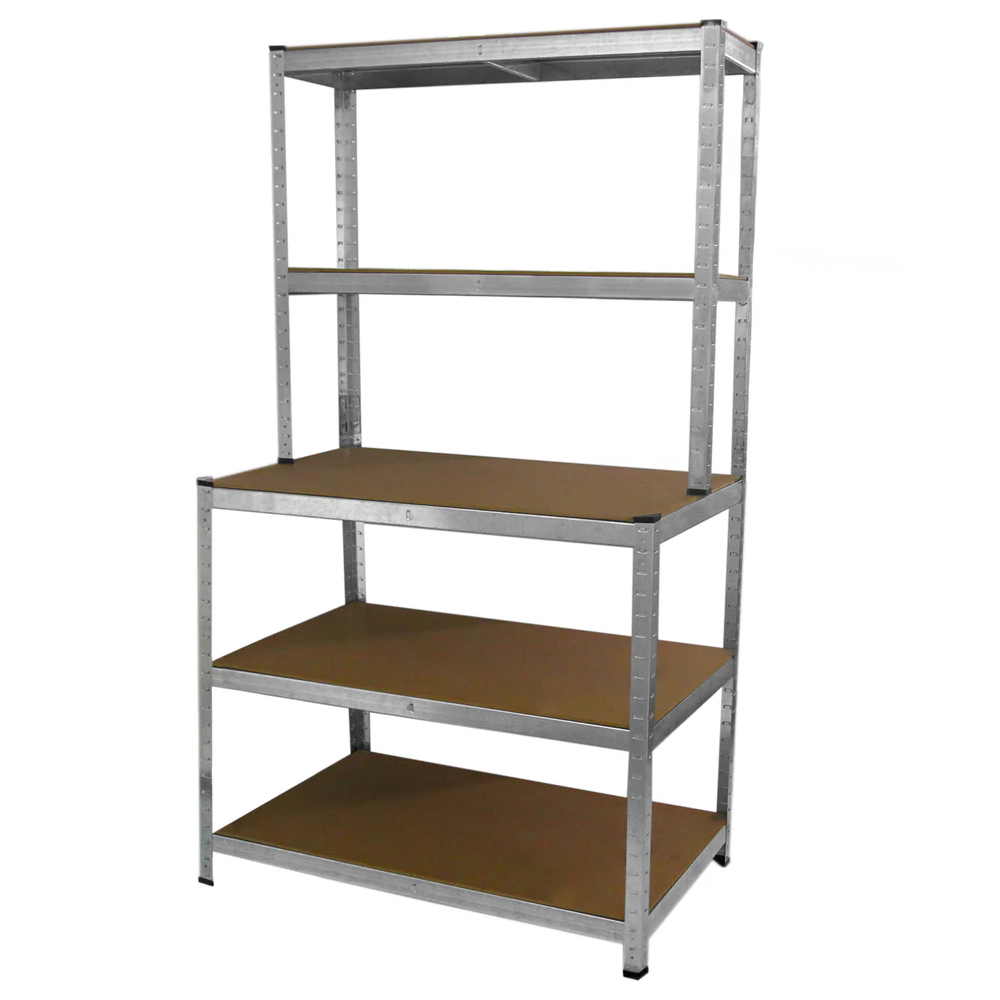 Clear away all that clutter with the Monster Shop Racking Galwix Workbench Shelving Unit. Supports 900kg of evenly distributed weight, you can store almost anything without worry. With 3 large bottom shelves and 2 smaller top shelves, you’ll have ample space to store tools and parts while also having room to work from the unit. This workbench shelving unit is 100% boltless and simply slides together, requiring only the rubber mallet (not included) with the product for easy assembly. Finished with hard-wearing and corrosion-resistant galvanised steel, this unit is perfect for any workshop, garage, or shed. It also comes with rubber feet to protect your floors and shelving unit. The Monster Racking unit features adjustable central workbench height (80-100cm), MDF shelves, and a robust structure made from 1.2mm galvanised steel. Dimensions are H180 x W100 x D60cm.