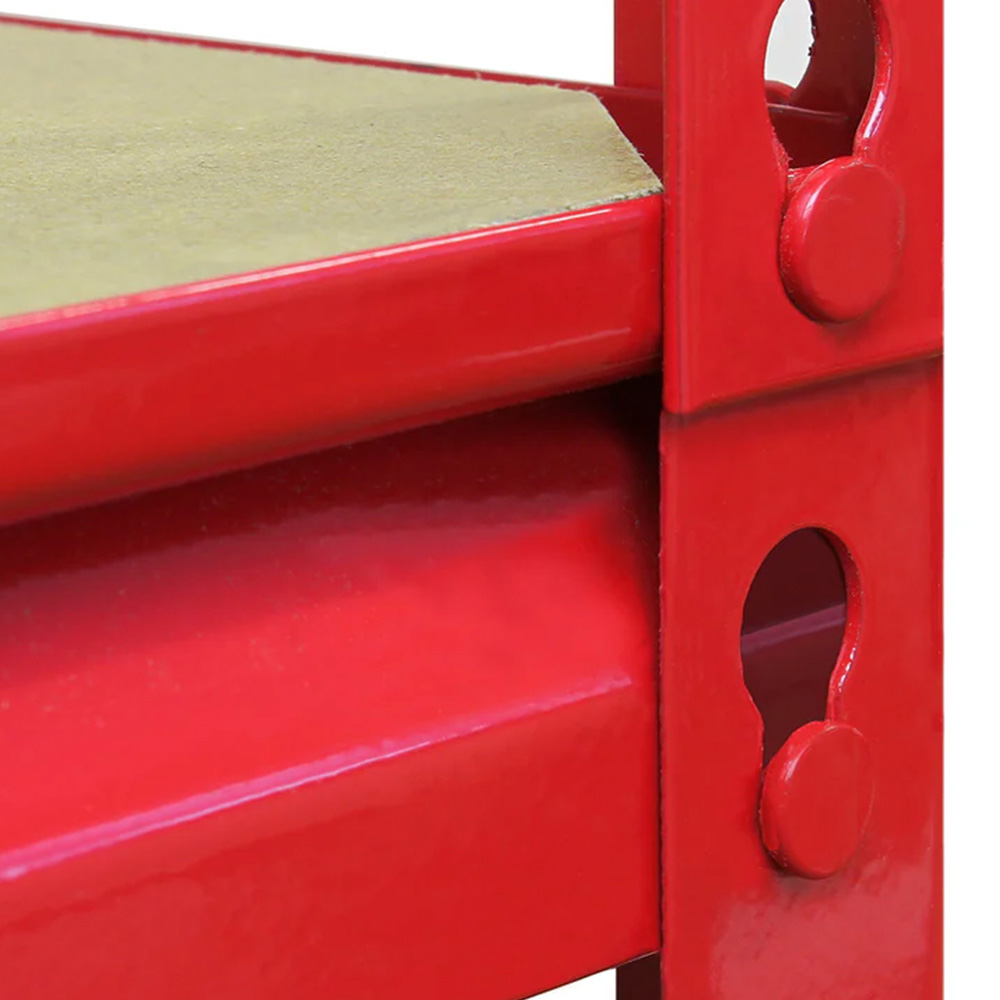 Transform your storage space with the Monster Shop Z-Rax Red Corner Shelving Rack 90cm. This sturdy corner shelving unit is a versatile and robust storage solution to create a larger racking system. Constructed from 1.2mm thick steel, it has the strength to support up to 265kg of evenly distributed weight on each shelf. Whether it's for your garage, workshop, warehouse, stock room, or office, this corner racking is a perfect fit. It's easy to assemble and completely boltless, requiring only a rubber mallet for installation. The powder-coated bright red finish ensures long-lasting colour, while the thick MDF boards offer durability and can be customised with paint or treatments. Additionally, the rack can be split into two workbenches or smaller shelves, and the adjustable shelf heights accommodate larger items. Thanks to the simple key-hole mechanism, no bolts, screws, or power tools are necessary for assembly. To protect your floor, the shelves feature 10 molded feet at the top and bottom. Please note: The MDF included is untreated and it is advised to treat each board before using it in cold or damp environments. Dimensions: H183 x W90 x D45cm.