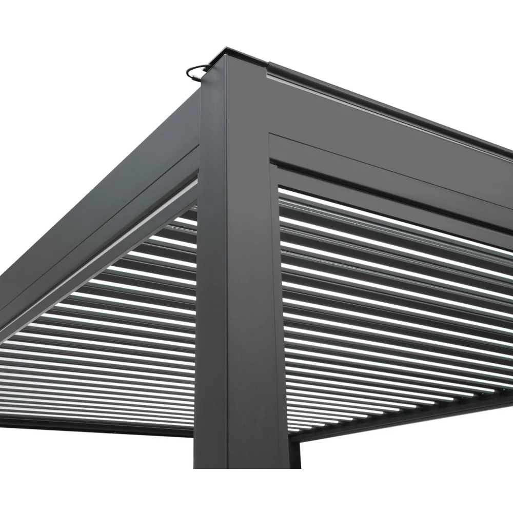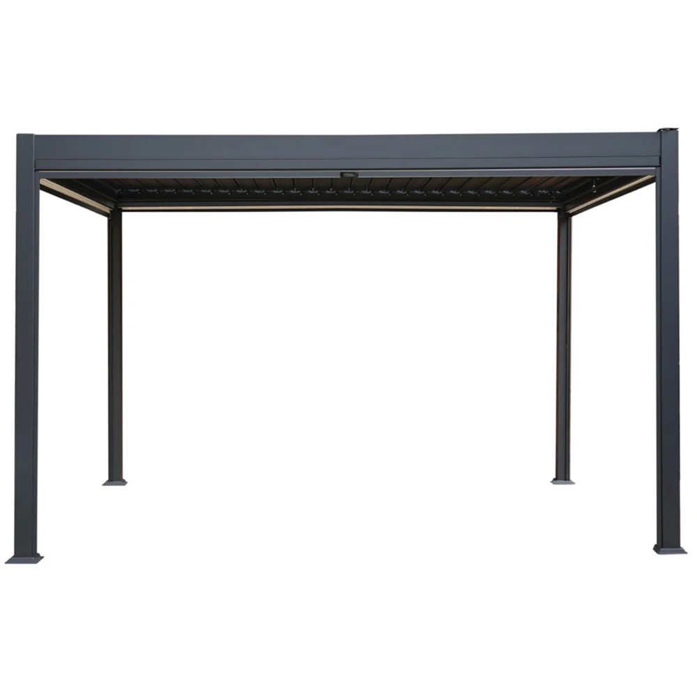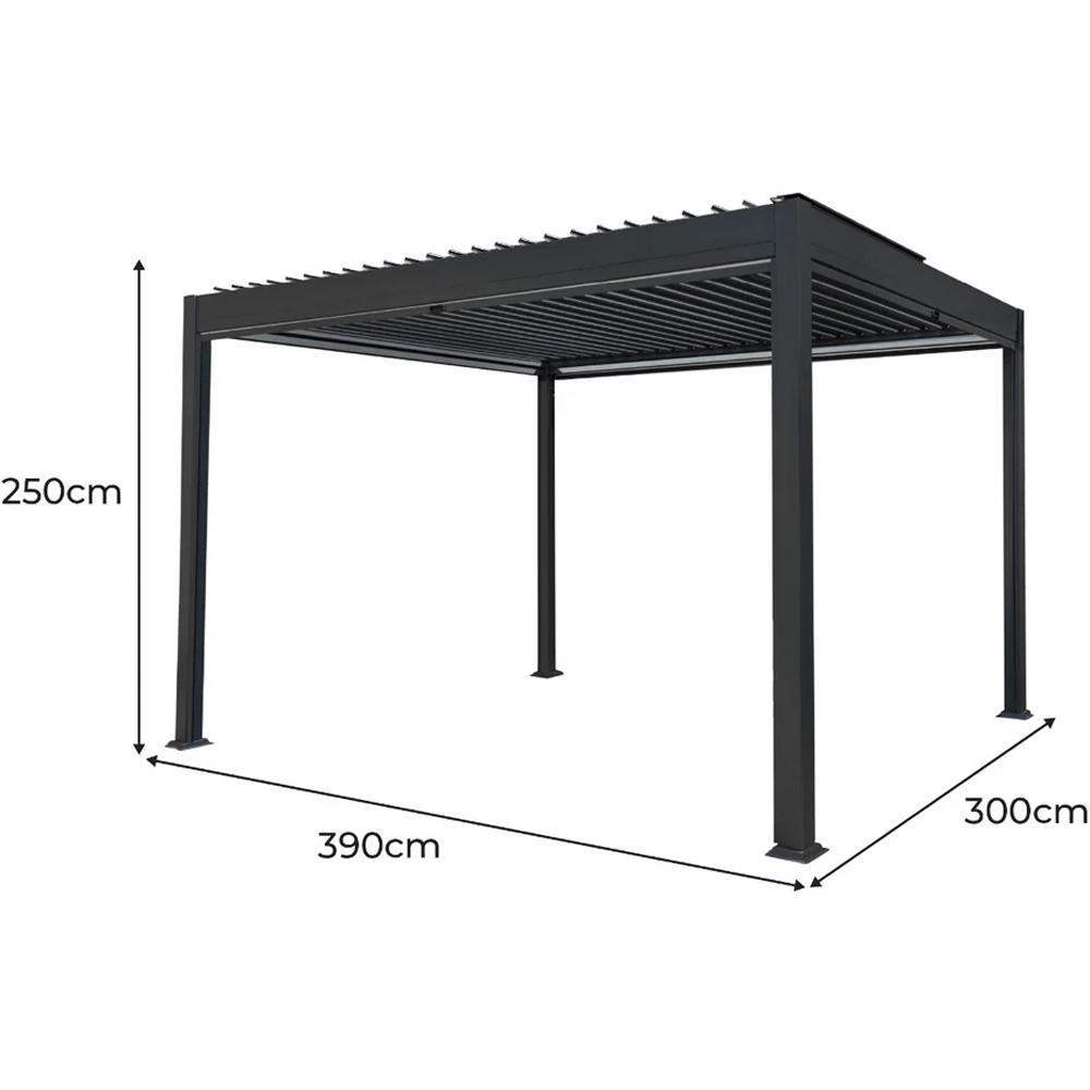 Transform your outdoor space into a stylish and relaxing sanctuary with the MonsterShop 4 x 3m Black Aluminium Pergola with LED Lights. This pergola is designed to enhance any garden or outdoor area, seamlessly combining functionality with visual appeal. Constructed from high-grade aluminium with a sleek powder-coated grey finish, it guarantees exceptional strength and resilience against various weather conditions. Whether placed on your patio, garden, or backyard, its modern design adds a touch of sophistication and becomes a captivating focal point for entertaining guests or unwinding outdoors. With adjustable louvres and a user-friendly crank handle, this aluminium pergola gives you full control over sunlight and shade, allowing you to customize your outdoor environment to suit your specific needs and preferences. Whether you desire a sun-drenched retreat or a shaded sanctuary, simply adjust the louvres with the easy-to-use manual system. It also has retractable blinds on each side for tailored shade and privacy catering to your every preference. With daylight fades, immerse yourself in the enchanting ambience cast by LED lights delicately placed around the internal edge, creating a warm and inviting glow. Effortlessly manage your LED lights with the intuitive control panel, granting you full control over brightness and temperature settings to suit your mood. Powered by both solar energy and an external adaptor, it offers flexibility and sustainability for uninterrupted illumination. Whether hosting lively gatherings or relishing quiet moments of solitude, the pergola sets the stage for unforgettable experiences under the open sky. Say goodbye to water pooling and unsightly runoff with our innovative built-in drainage system. Featuring U-shaped channels, it seamlessly diverts water from the louvres to the frame, keeping your outdoor space dry and inviting even during rainy days. Installation is a breeze with the comprehensive assembly kit, which includes a spanner, screwdriver, and hex keys for a hassle-free setup. Plus, for added safety and stability, ground bolts are included to securely anchor your pergola to any outdoor surface.