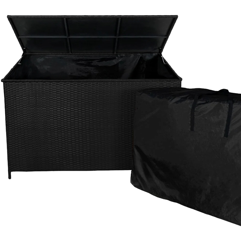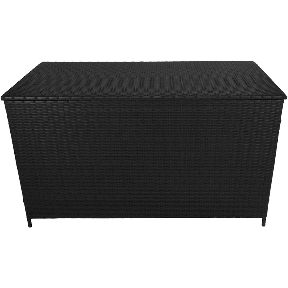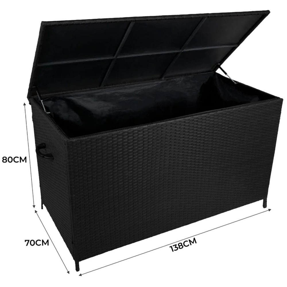 Transform your outdoor living space with the MonsterShop 582L Black Rattan Cushion Storage Box. The robust, powder coated steel frame complemented by stunning UV resistant black rattan finish ensures unmatched durability. The waterproof interior lining prolongs the lifespan of the chest and preserves its contents, shielding them against various weather conditions. Boasting a generous 582L capacity, this chest provides comfortable housing for all the cushions. It ensures their protection during the colder, rainier months, keeping them dry and in pristine condition. Enhancing its functionality, the premium oxford waterproof storage bag, complete with a zip and handles, is meticulously tailored to fit your corner set cushions and perfectly nestles inside the box. This seamless integration facilitates a swift and efficient transfer of cushions from your furniture into the box. With gas-assisted lid lift mechanism, it provides effortless access to store your belongings. This innovative feature, equipped with two pneumatic pistons, ensures a smooth lift and gentle closure, freeing your hands for a more convenient user-friendly experience. Designed for your convenience, the storage box features a handle on the left side and two wheels on the right-hand side, making it effortlessly movable around your outdoor space. This flexibility allows you to easily rearrange your patio area, adapting to changing needs. Size: H80 x W138 x D70cm.