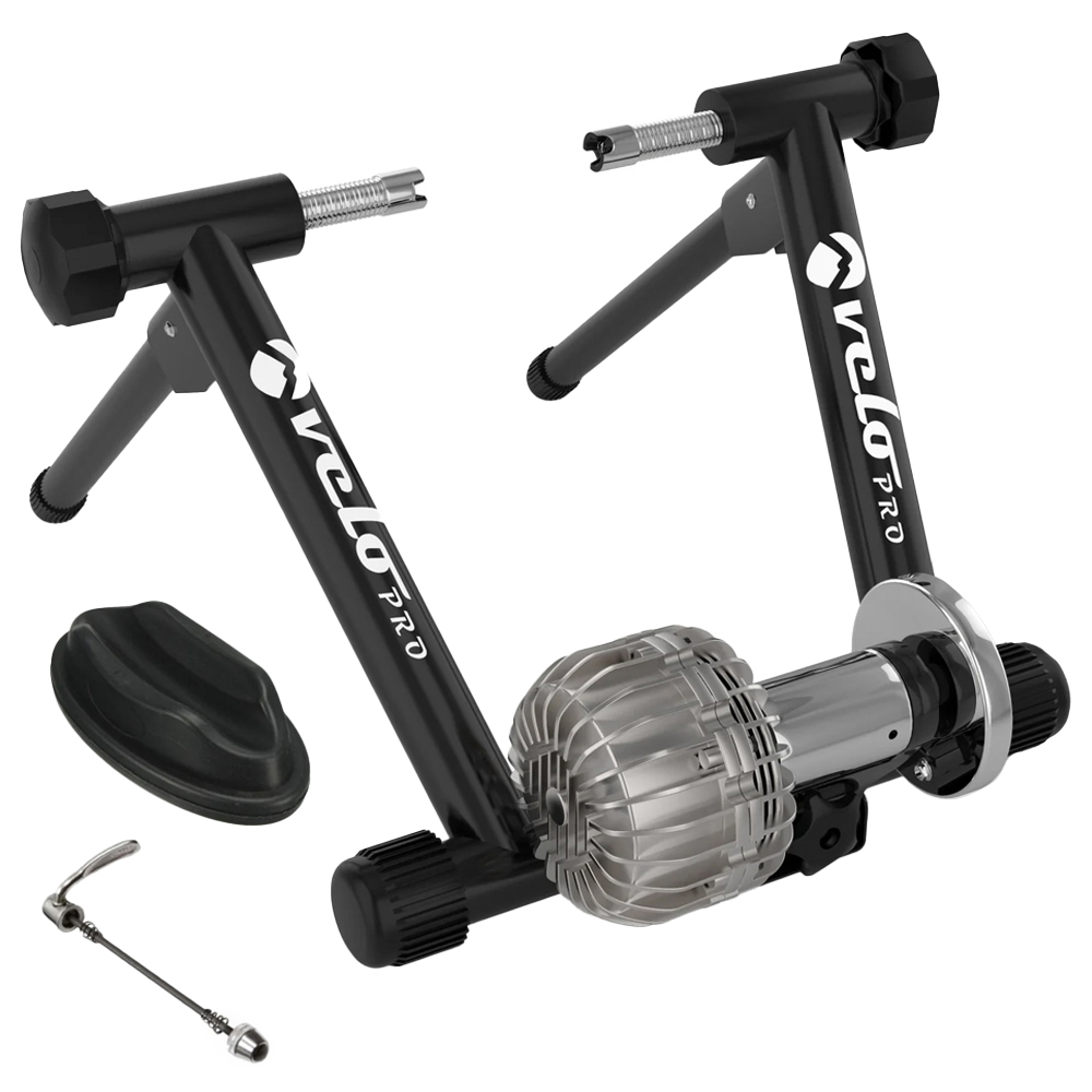 Transform your home into a cycling haven with the Velo Pro Fluid Turbo Trainer. Designed to provide an authentic road feel, this turbo trainer features a heavier flywheel for smoother, more consistent performance, making it the perfect solution for indoor cycling training. Whether you’re riding a road, hybrid, or mountain bike, the Velo Pro is compatible with wheel sizes ranging from 26” to 29” for MTB and 700c for road/hybrid bikes. Enjoy a super stealthy quiet ride thanks to the magnetic flywheel and silicone oil lubrication, ensuring a peaceful workout session without disturbing your surroundings. The heavy-duty steel frame provides excellent stability, while the wide base ensures your bike stays securely in place during intense rides. Easy to set up and use, the Velo Pro turbo trainer operates through your bicycle’s own gear system, eliminating the need for additional levers or adjustments. Whether you’re training for an event or simply looking to improve your fitness, the Velo Pro offers a real-road experience without leaving the comfort of your home.