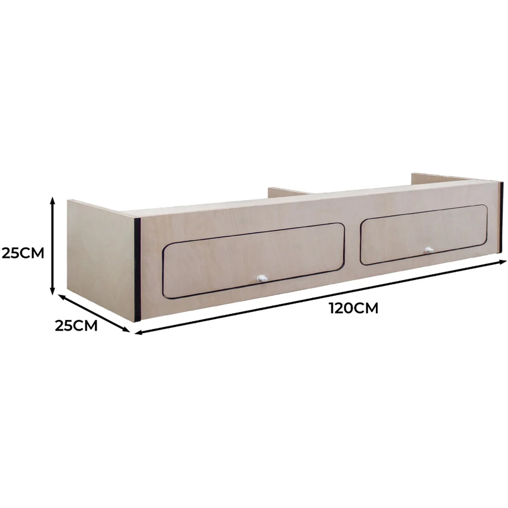 Elevate your camping life with the MonsterShop Black Trim Overhead Camper Cabinet 120 x 25 x 25cm. This cabinet is ideal for the self-build and DIY market, providing the perfect storage solution for life on the road. It is space-saving and practical, designed to fit securely overhead and allow you to maximise your living space without sacrificing storage. It features a sleek and modern design that seamlessly blends into any camper van interior. The unfinished surface gives you the added flexibility to customise it however you desire. Sand it, paint it, wrap it or spray it. The choice is yours! The solid black trim enhances the overall finish of your cabinet, giving it a professional and polished aesthetic. The added layer of protection also enhances the unit's durability, making it more resistant to wear and ensuring it maintains its attractive appearance for a long time. This 120cm wide overhead camper van cupboard features ample storage space. It comes with a central divider that separates the cabinet into two equally sized compartments perfect for organising your belongings. Each door benefits from a soft close hinge for a more gentle and seamless opening and closing. Its push button handles ensure your belongings are securely locked away while on the move. The cabinet also features an open-back design to offer complete versatility. You can easily adjust the cabinet and seamlessly fit it into your camper's interior. It is crafted from high-quality birch plywood that is built to last. The sturdy construction ensures it can withstand even the bumpiest road conditions, making it a reliable and long-lasting addition to your camper van. The installation is easy and hassle-free, with pre-drilled holes and included fixings to help you quickly and easily secure the cabinet.