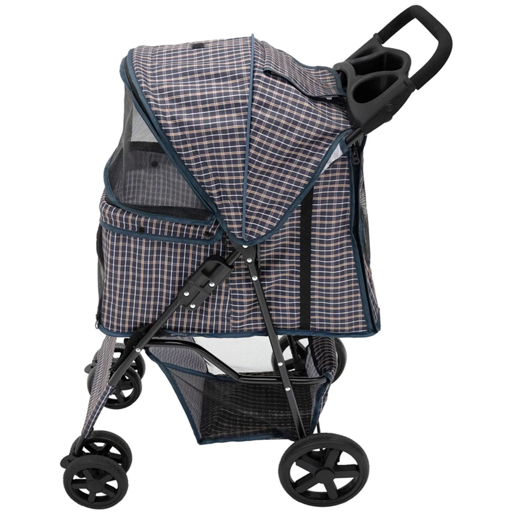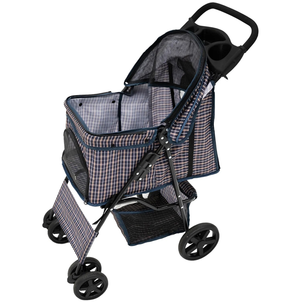 Experience the perfect outdoor companion for pet owners with this Monstershop Blue Tartan Pet Stroller with Rain Cover. This innovative stroller is designed to provide the ultimate comfort and convenience for both you and your pet. Crafted with a sturdy steel frame, this pet stroller offers superior strength and security, capable of supporting pets weighing up to 15kg. This robust construction supports its longevity and ensures your pet's safety during every outing. Adding to its practicality, the stroller features a foldable design, allowing seamless storage and effortless transportation. Never worry about the unpredictable weather thanks to the stroller's fold-out canopy and included rain cover. This thoughtful duo ensures your pet stays comfortable in any weather. The canopy provides shade on sunny days, protecting your furry friend from intense sunlight, while the rain cover acts as a shield during unexpected downpours, keeping your pet dry and snug inside the stroller. Manoeuvring the stroller is effortless, thanks to the 2 x 8inch rear wheels equipped with brakes and the 4 x 6inch front swivel wheels. Whether you're strolling through parks or on bumpy terrain, these wheels provide a smooth and secure ride for your pet. The foam-covered handle adds an extra layer of comfort, ensuring a pleasant grip and control during your adventures. The strategically placed ventilation windows ensure continuous airflow, keeping your pet cool and comfortable during the ride. These windows not only provide fresh air but also offer your pet a chance to observe the surroundings. Additionally, the stroller comes with a removable cushion. This allows you to easily clean the cushion and maintain a hygienic environment for your pet while giving them a plush space to rest. A generously sized basket at the base offers ample space to stow your pet's necessities treats, toys, and water bowls alongside your personal items like keys and wallets. Plus, with the added convenience of a secure cup holder, your beverages are always within reach, allowing you to enjoy a mid-walk refreshment. No more juggling bags and cups everything you need is right at your fingertips, ensuring a stress-free and comfortable outing. Create unforgettable memories on your outdoor adventures while ensuring your pet travels in style, comfort, and security with these foldable pet strollers.