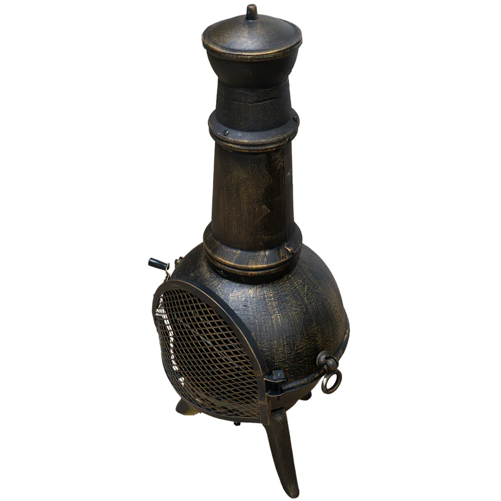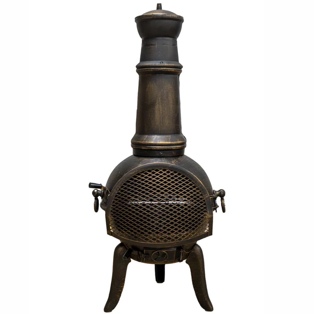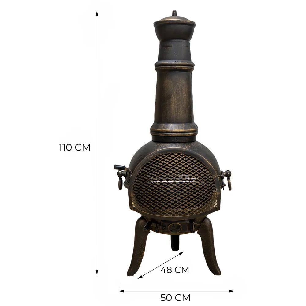 Experience the ultimate outdoor comfort with the MonsterShop Cast Iron Chiminea. This chiminea is designed to make your outdoor gatherings warm and memorable, allowing you to stay outside even when it's chilly. Made from high-quality cast iron, it efficiently radiates heat, warms up quickly, and stays warm for longer periods. The chiminea comes with a convenient spark guard door for added safety and easy wood loading. It also features an adjustable air vent for flame control and a high-quality rain cover for weather protection. In addition, it includes a BBQ rack and a poker, making it perfect for hosting garden parties. The bronze effect finish adds an elegant touch to your patio, making it both a functional outdoor heater and a beautiful decorative piece. With its robust construction and considerate design, this cast iron chiminea is an investment in endless outdoor enjoyment. The dimensions are H110 x 50cm, and it weighs 23.5 kg.