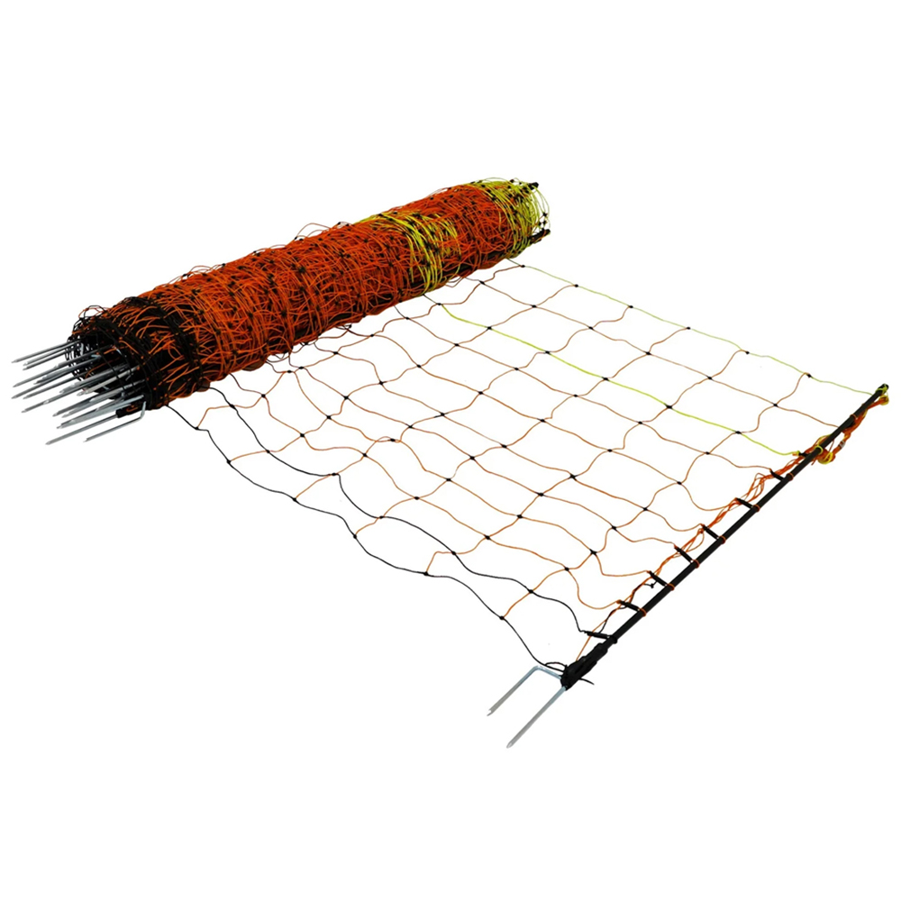 Experience the ultimate containment solution for poultry, hens, geese, and turkeys with this Monstershop Electric Poultry Netting 50m. Standing tall at 120cm, it forms a robust barrier that’s both highly effective and easy to set up. With a length of 50 meters, this netting provides ample coverage for a wide range of property sizes and configurations. Engineered for stability, the netting includes 14 durable double spikes, each measuring 17.5cm, made from sturdy glass fibre tubes with a protective PVC coating. This robust design keeps your fence firmly anchored, maintaining a secure, upright position under different conditions. Crafted from polyethylene mesh with integrated stainless steel wiring, the netting is built to be both robust and weather-resistant, suitable for prolonged outdoor use. It includes a total of 11 wires: the top wire is reinforced with six 0.2 mm stainless steel conductors, and each of the eight middle wires is embedded with three conductors of the same thickness, providing a consistent and reliable electrical barrier. The bottom two wires are not electrified, providing additional structure without compromising safety near the ground. For full functionality, simply connect an energiser to the netting. This produces a gentle but effective pulse that’s safe for your birds but deters predators from breaching the boundary. Additionally, the netting’s design allows you to set up the netting in a straight line rather than requiring a loop, offering you more flexibility for unique layouts. To make setup and upkeep even easier, this netting includes a handy repair kit and 10 extra ground spikes, providing you with all the essentials for seamless installation and long-lasting stability. Whether you’re a farmer or a homesteader, this electric poultry netting combines safety, durability, and flexibility to create a reliable solution for protecting your flock.