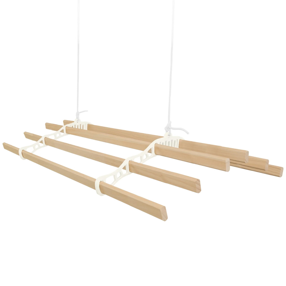 Discover a smarter, more elegant way to dry your laundry with our 0.9m 6-lath ceiling pulley clothes airer. Perfect for those who value both functionality and style, this space-saving solution allows you to dry your clothes naturally while adding a touch of traditional charm to your home. Whether you're looking for a sustainable alternative to tumble dryers or simply need to maximise your living space, this ceiling airer has you covered. Built to last, the airer features six varnished pine laths, each 90cm long, offering generous space for large clothing loads, towels, or bedding. The sturdy pulley system is easy to use and designed to lift heavy items effortlessly. Fitted with robust powder-coated iron rack ends and brackets in a sophisticated hue, this airer not only enhances your space but also ensures lasting durability. The included fixings make setup a breeze, allowing you to easily mount the airer to most ceiling types, including sloped ones, for versatile and convenient use. With its blend of timeless design and practical features, this ceiling pulley airer is a wonderful addition to any home. Enjoy the benefits of natural drying while adding a touch of charm to your space, making laundry day a little more enjoyable.