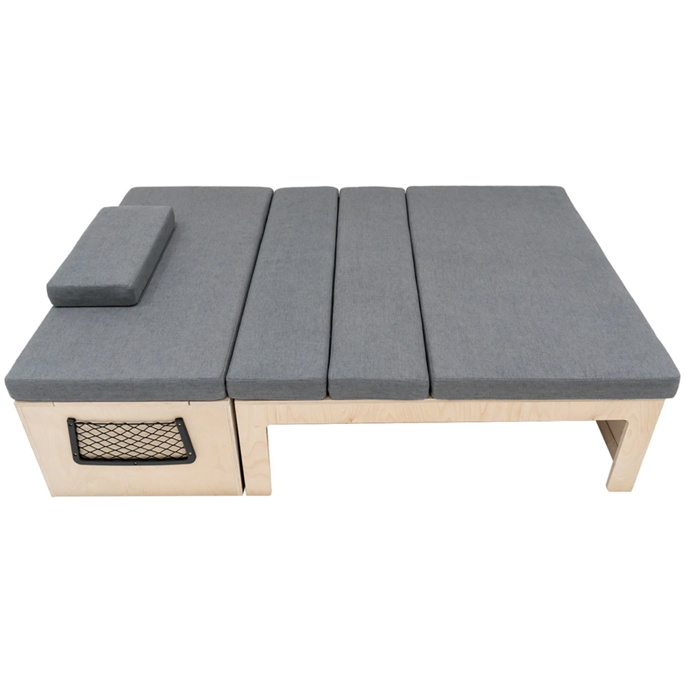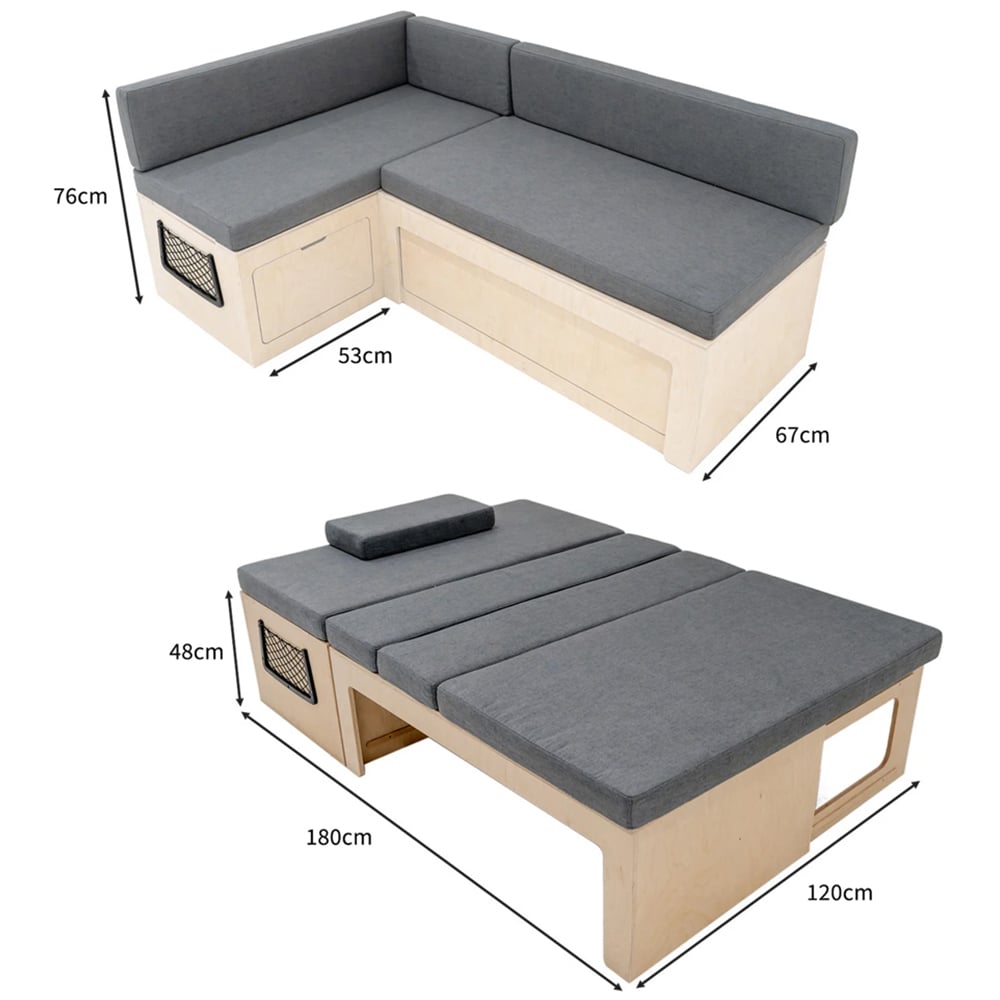 Transform your camper van into a practical and inviting space with Monstershop L-shaped camper Van Bed. Designed for both comfort and functionality, this versatile piece optimizes your van’s interior without sacrificing style or convenience. By day, it offers a comfortable seating area for relaxing or entertaining, and by night, it effortlessly transforms into a spacious bed with a user-friendly pull-out mechanism extending to 120cm. Built from 15mm thick birch plywood, the frame is durable and reliable, perfect for life on the road. Under-bed storage compartments and two flexible storage nets keep essentials organised, while 8cm thick high-density sponge cushions provide ultimate comfort. Upholstered in washable grey linen covers, the cushions combine modern style with easy maintenance. With a wheel arch clearance of up to 350mm, this sofa bed fits seamlessly into most van layouts. Assembly is quick and hassle-free with the included fixing kit. Whether you seek comfort, practicality, or a stylish upgrade, the L-shaped camper van sofa bed enhances every adventure with ease and elegance.