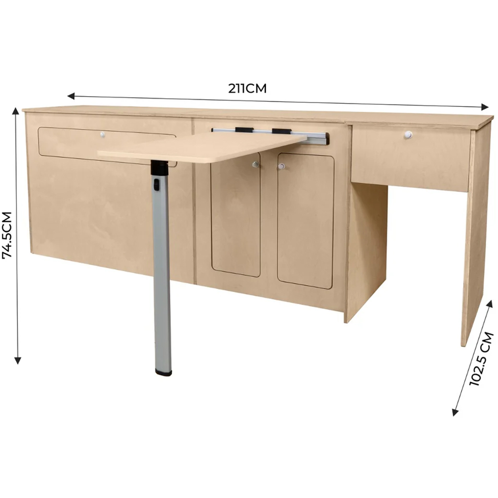 Take your next adventure to the next level with the Monster Shop Left Hand Camper Kitchen Pod and Black Compressor Fridge 42L. This kitchen pod is made from durable 15mm birch plywood and features a sleek, natural appearance that blends seamlessly with any camper van interior. Its foldaway table and integrated storage compartments maximize space efficiency, keeping your essentials organized and easily accessible. The double-door cupboard has an adjustable shelf, providing unparalleled flexibility, and the versatile towel holder can be placed wherever you prefer. The integrated KuKoo compressor fridge keeps your food and beverages fresh on the go and is designed to fit perfectly into the pod, optimizing space utilization. With a generous 42L fridge capacity and a 4.5L freezer, it offers ample storage for your groceries of various shapes and sizes. The reversible door hinge allows for left- and right-hand door openings, making it adaptable to any campervan layout. Enjoy hassle-free meal prep with the kitchen pod's convenient layout and ample workspace. The dimensions are H74.3 x W211 x D51.5cm, and the total load capacity is 82.1kg.