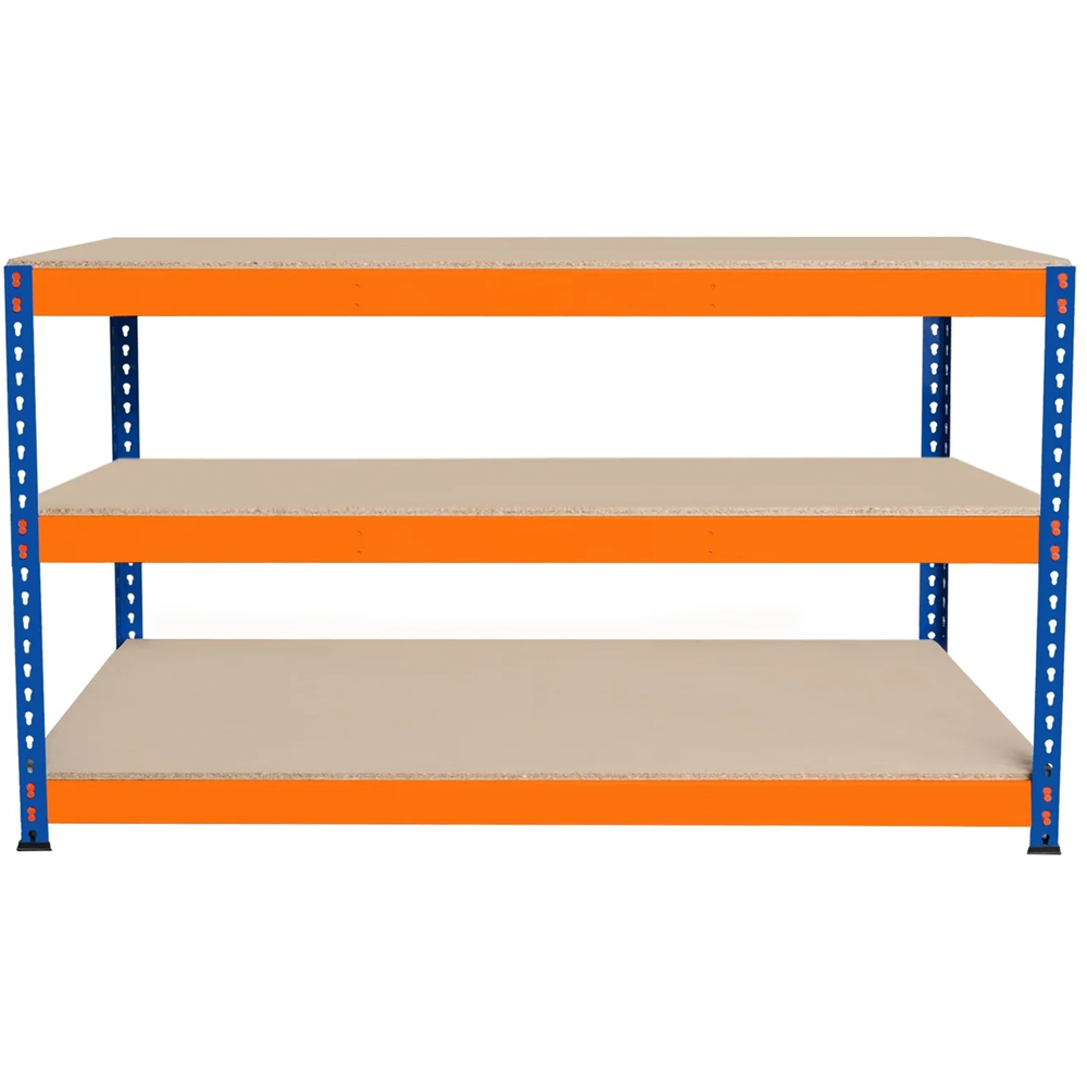 Transform your garage into a high-efficiency workspace with this robust workbench. Constructed with a heavy-duty steel frame and durable chipboard shelves, this workbench is built to withstand demanding tasks and provide reliable support. What's more, its steel frame is meticulously coated with powder paint, ensuring prolonged resistance against wear, thereby enhancing its longevity. This workbench boasts a remarkable capacity per shelf. Whether you're working on large projects or need to store heavy tools and materials, this workbench has you covered. Flexibility is key with the adjustable lower shelf arrangement, allowing you to customise the spacing according to your needs. Plus, the workbench offers a 100% boltless assembly design, making setup quick and hassle-free, allowing you to get to work in no time. The workbenches come equipped with support bars per shelf for added sturdiness and reliability. Bid farewell to shaky surfaces and embrace the assurance of a steady workspace. In addition, the workbenches come equipped with rubber feet to safeguard both the floor and the unit itself, minimising damage and maximising stability. Ideal for professional tradespeople and DIY enthusiasts alike, this spacious and practical workbench is the ultimate upgrade for your workshop, making your DIY projects easier than ever to carry out.