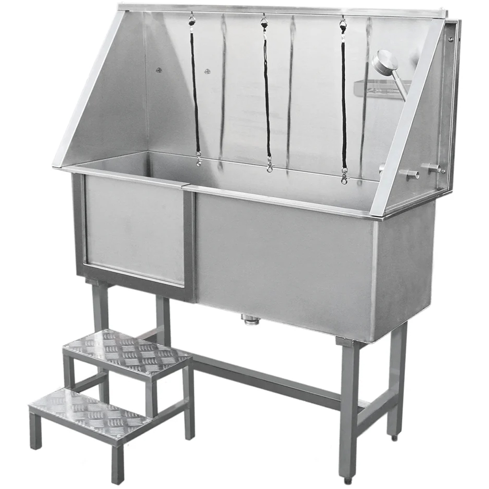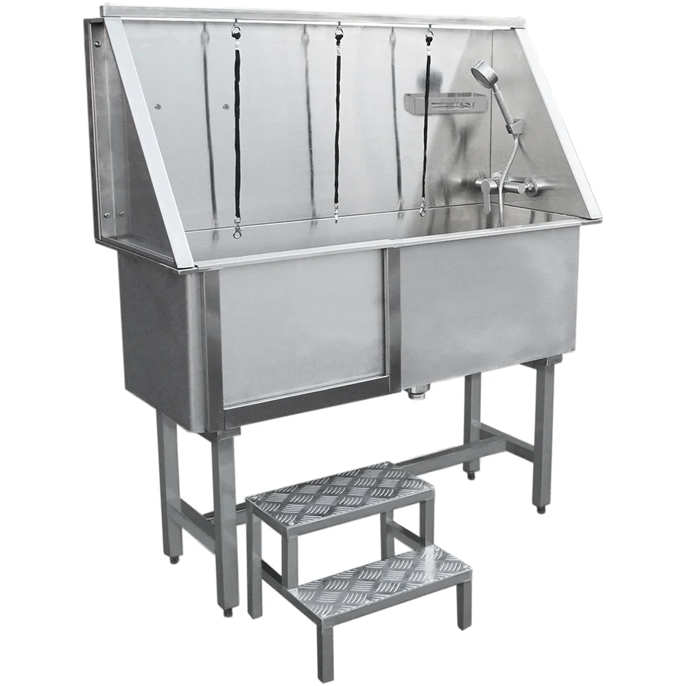 Pamper your dogs with this MonsterShop Stainless Steel Dog Washing Station. This stainless-steel pet bath is designed for busy pet groomers. The portable steps and sliding door make it super easy to get furry friends in and out of the tub. Puppies stay safe and secure with the anti-slip rubber mat and three lead-fixing straps. Whether clients are as small as a chihuahua or as large as a labrador, they can all be accommodated by using the removable floor booster. The mixer tap and large shower head allow for finding the perfect temperature for scrubbing pups. Keeping the pet bathing area and tidy is easier with the handy strainer plug catching any hair, preventing hair build-up. The included rack stores all shampoo and conditioner bottles and tubs, and a free pair of pet bathing gloves is included to protect hands while cleaning paws. Built to last, this bath features 304 stainless steel construction. It has a capacity of 120kg and a weight of 48kg. Dimensions: H136 x W47.5 x L127cm.