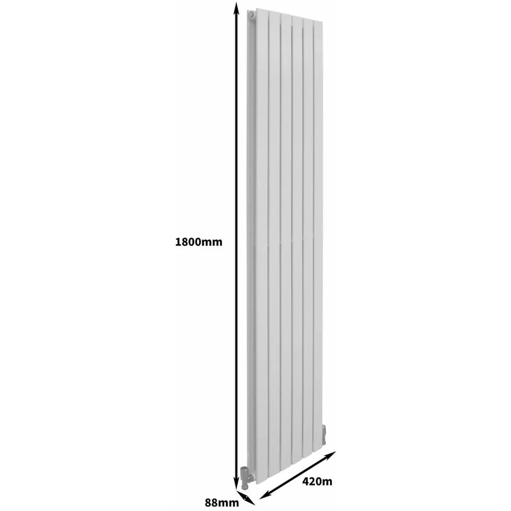 Enhance the style of your home or workspace with the MonsterShop White Flat Radiator. This modern and sleek designer radiator not only provide efficient heating but also add a bold and stylish feature to your interior. With dimensions of 1800mm x 420mm, it is suitable for various spaces. Made from premium carbon steel - it ensures durability and strength. The 60mm x 15mm steel tubes offer a larger surface area and thicker tubes, resulting in a higher heat output. This means that your house will stay warm for longer, creating a cosy and inviting atmosphere. The triple layered coating of these radiators provides resistance against scratches, discolouration, and corrosion. The powder Interior Painted surface gives a smooth and even finish that is easy to clean and maintain. Additionally, the radiators come with a cleaning brush and are backed by CE approval, EN442 certification, and a 15-year guarantee for your peace of mind. Installation is hassle-free, as all fixtures and fittings are included. Thanks to the standard 0.5 inch BSP inlet and outlet, these radiators are compatible with various valve types, giving you the flexibility to choose the right valve for your needs.