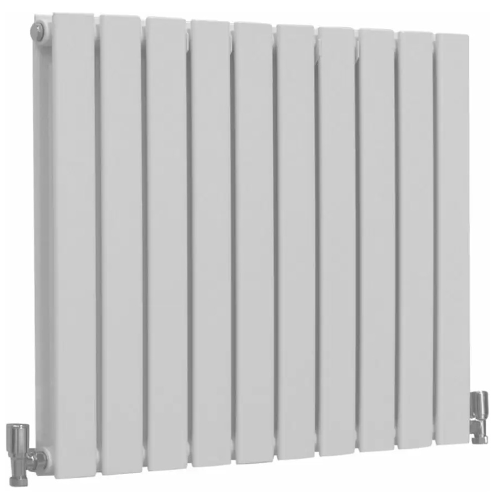 Enhance the style of your home or workspace with the MonsterShop White Flat Radiator. This modern and sleek designer radiator not only provide efficient heating but also add a bold and stylish feature to your interior. With dimensions of 600mm x 700mm, it is suitable for various spaces. Made from premium carbon steel - it ensures durability and strength. The 60mm x 15mm steel tubes offer a larger surface area and thicker tubes, resulting in a higher heat output. This means that your house will stay warm for longer, creating a cosy and inviting atmosphere. The triple layered coating of these radiators provides resistance against scratches, discolouration, and corrosion. The powder Interior Painted surface gives a smooth and even finish that is easy to clean and maintain. Additionally, the radiators come with a cleaning brush and are backed by CE approval, EN442 certification, and a 15-year guarantee for your peace of mind. Installation is hassle-free, as all fixtures and fittings are included. Thanks to the standard 0.5 inch BSP inlet and outlet, these radiators are compatible with various valve types, giving you the flexibility to choose the right valve for your needs.