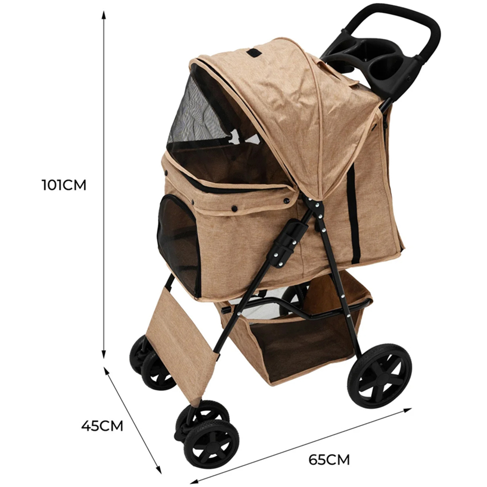 Experience the perfect outdoor companion for pet owners with this Monstershop Woven Beige Pet Stroller with Rain Cover. This innovative stroller is designed to provide the ultimate comfort and convenience for both you and your pet. Crafted with a sturdy steel frame, this pet stroller offers superior strength and security, capable of supporting pets weighing up to 15kg. This robust construction supports its longevity and ensures your pet's safety during every outing. Adding to its practicality, the stroller features a foldable design, allowing seamless storage and effortless transportation. Never worry about the unpredictable weather thanks to the stroller's fold-out canopy and included rain cover. This thoughtful duo ensures your pet stays comfortable in any weather. The canopy provides shade on sunny days, protecting your furry friend from intense sunlight, while the rain cover acts as a shield during unexpected downpours, keeping your pet dry and snug inside the stroller. Manoeuvring the stroller is effortless, thanks to the 2 x 8inch rear wheels equipped with brakes and the 4 x 6inch front swivel wheels. Whether you're strolling through parks or on bumpy terrain, these wheels provide a smooth and secure ride for your pet. The foam-covered handle adds an extra layer of comfort, ensuring a pleasant grip and control during your adventures. The strategically placed ventilation windows ensure continuous airflow, keeping your pet cool and comfortable during the ride. These windows not only provide fresh air but also offer your pet a chance to observe the surroundings. Additionally, the stroller comes with a removable cushion. This allows you to easily clean the cushion and maintain a hygienic environment for your pet while giving them a plush space to rest. A generously sized basket at the base offers ample space to stow your pet's necessities treats, toys, and water bowls alongside your personal items like keys and wallets. Plus, with the added convenience of a secure cup holder, your beverages are always within reach, allowing you to enjoy a mid-walk refreshment. No more juggling bags and cups everything you need is right at your fingertips, ensuring a stress-free and comfortable outing. Create unforgettable memories on your outdoor adventures while ensuring your pet travels in style, comfort, and security with these foldable pet strollers.