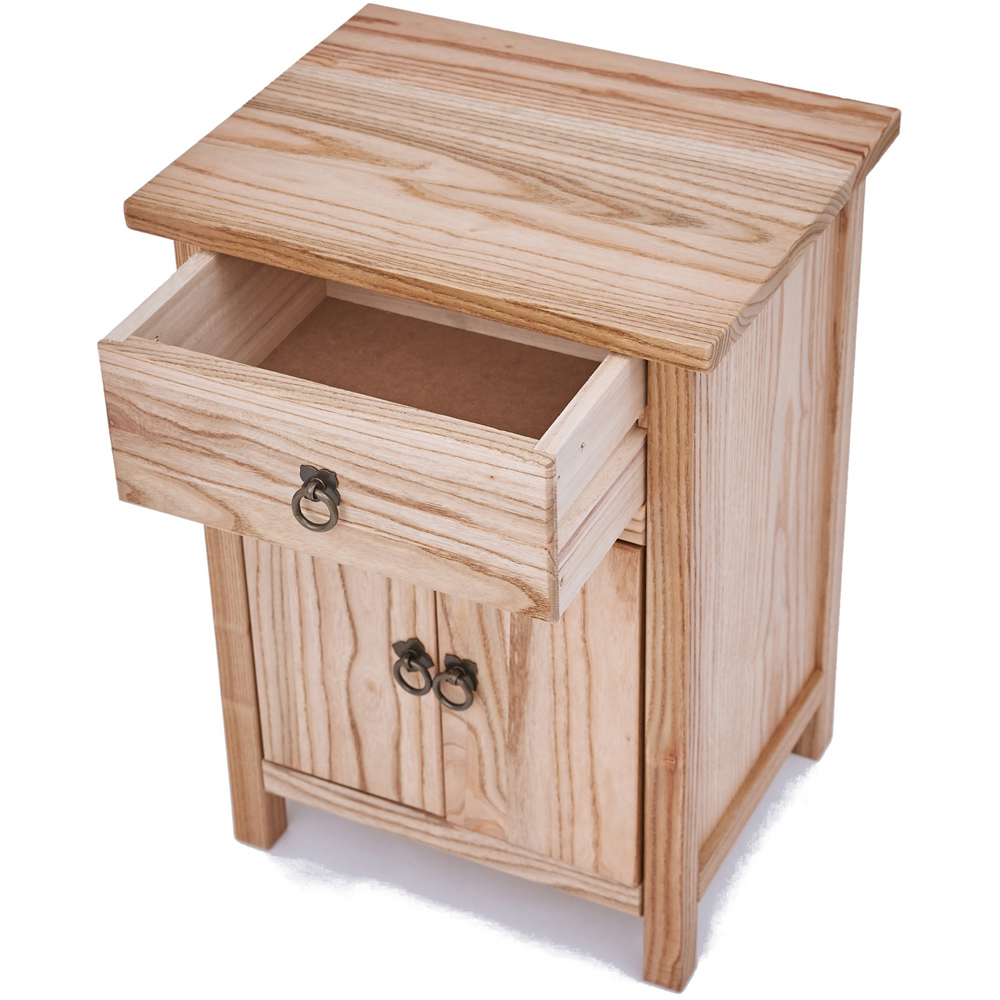 This Montese 2 Door Single Drawer Bedside Table with ring handles has a simple but pleasing design inspired by traditional Chinese cabinets. It is produced by skilled craftsmen to the highest standards using responsibly sourced hardwood and veneers. It's made using a combination of solid Sassafras wood from the Oak family and ash veneer. The solid wood parts are brushed and finished on a clear lacquer to give them an aged look that will look great on any room set. The drawer and cabinet below provide enough space to take your night-time essentials and keep them close to hand, allowing the top to be free for your alarm or mobile phone. These attributes, combined with a simple construction for easy assembly, make it a great product for any household.