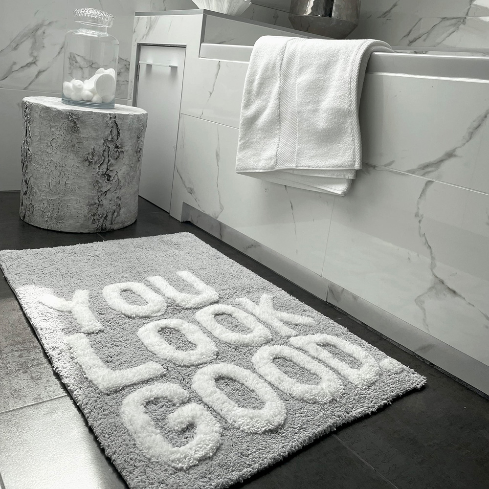 A slogan bath mat can add a playful touch to your bathroom floor. Super thick and absorbent, this fun bath mat will keep your bathroom floors dry and slip free - thanks to built-in non slip backing. Ultra soft to the touch, this bath mat will cushion your feet as you step out of a relaxing hot bath. The contrasting grey and white colours ensure this bath mat doesn't go unmissed. The slogan is crafted in a fluffy, deep pile to ensure this complimenting design stands out and adds a delightful addition to your bathroom décor.