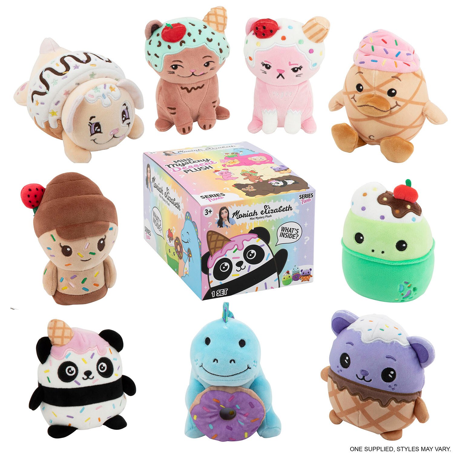 Collect and unbox Moriah Elizabeth's newest collection of Mystery Plush with this dessert-themed Moriah Elizabeth Mini Mystery Plush! Available in assorted styles, there are nine different characters to collect, including Shelly, Eustace, Ice Cream Bear, Sprinkle Panda, Dessert Pickle, Nilla, Dessert Georgie, Dessert Cuepy, and Dessert Derp! Each figurine comes in a blind box for surprise unboxing fun. And, you can track your collection with the collector poster inside! These adorable plushies are soft and huggable and are made from super soft materials with squishy bodies. Suitable for ages three years and above, it is the perfect gift for Moriah fans, art and craft lovers, collectors, and more!